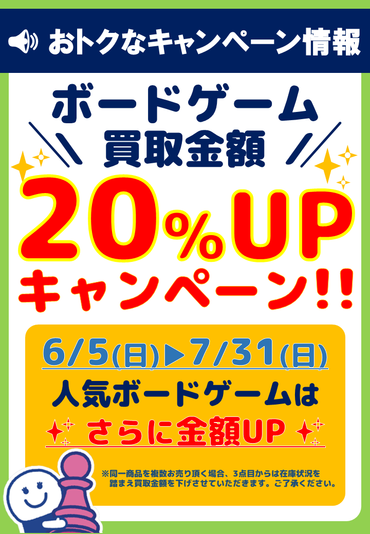 | 詳細内容 | イベント『ボドゲ20%アップCP』開催中!【イベント詳細】 期間:6/5~7/31まで ただ今ボードゲームの買取金額20%キャンペーン実施中! ★当スペースにてボードゲームを遊ぶ場合、ルール説明もさせていただいております!初心者の方も気軽にご利用ください! |