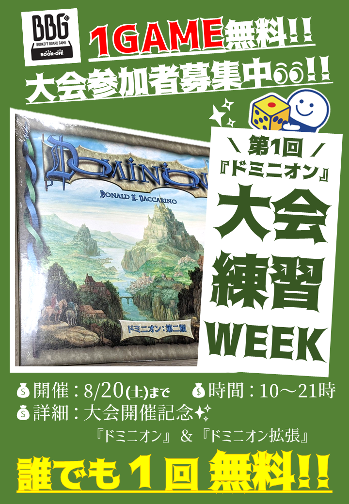 | 詳細内容 | 【イベント詳細】 期間:8/20(土)まで毎日 時間: 10:00(開店)~21:00(閉店) 内容:ドミニオン+ドミニオン拡張(同盟/海辺2/暗黒時代)が「1GAME無料」で遊べます