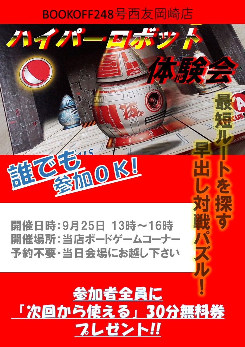 ★イベント概要★ 【ハイパーロボット🤖発売記念】 ルール説明あり&パズル系ボードゲーム体験会♪ 誰でも参加OKな気軽にボードゲームで遊べるイベントとなっております!! 最短ルート探し出せ!!ロボットをゴールへ!! 最短ルートを見つけ出した人の勝ち!! 参加無料&予約不要!! 気軽にご参加くださいませ お待ちしております✨ 【 新品・中古入荷情報こちら 】お問い合わせは電話・店頭・Twitterのメッセージまで!! |
