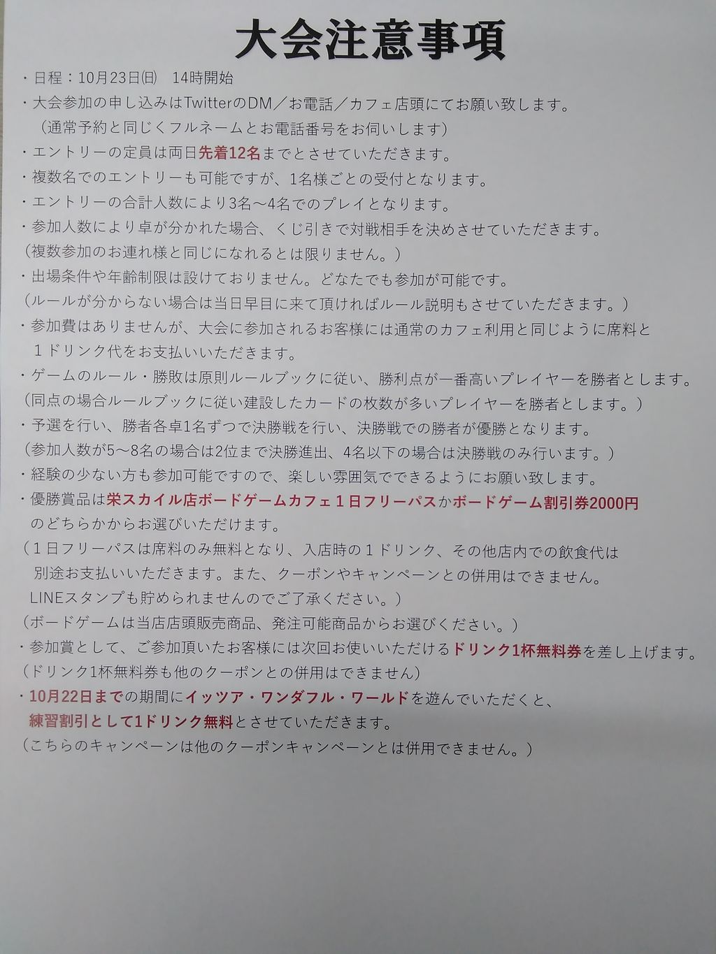 | 詳細内容 | BOOKOFF栄スカイル店ボードゲームカフェでは毎月ゲーム大会を開催しています❗毎月第2日曜日に『宝石の煌き杯』、第4日曜日は月替わりでゲーム大会を行います❗ 10月の第4日曜日は『It's A Wonderful World杯』を開催致します❗ プレイヤーは1帝国の王となり、様々な建築物を築き上げることで、他の帝国に自分の帝国の偉大さを見せつけるゲーム。作られた建造物は新たな資源を生み出し、より豊かな帝国の発展へと役立つでしょう✨ 定員は12名。3~4人で1卓。参加人数によって予選と決勝を行い、優勝者1名を決定します。使用する帝国カードはB面を使用します。同点の場合ルールブックに従い、完成した建築カードの枚数が多いプレイヤーが勝者とします。 また大会練習割りキャンペーンとして10/22までに当カフェで『It's A Wonderful World』を遊んでいただいたお客様はドリンク一杯無料とさせていただきます❗(こちらのキャンペーンはその他のキャンペーン、クーポンとの併用は出来ません) エントリーはお電話かTwitterのDMよりお願いいたします☺️ 電話 052-238-3361 Twitter https://mobile.twitter.com/bookoffbodoge 皆様のご参加お待ちしております✨ |
