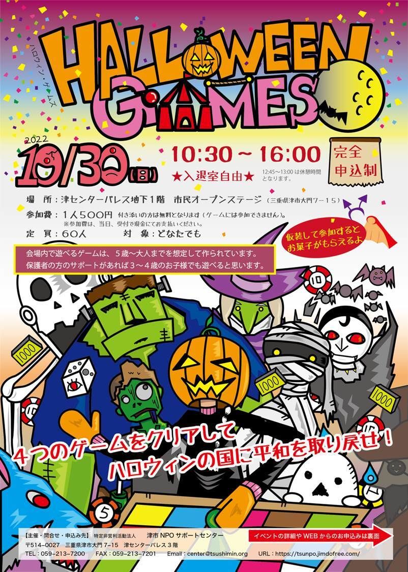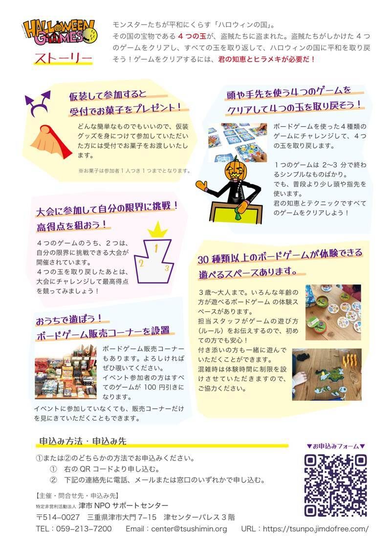 ②下記の連絡先に電話、メールまたは窓口のいずれかで申し込む。 特定非営利活動法人 津市NPOサポートセンター 仮装して参加すると受付でお菓子をプレゼント どんな簡単なものでもいいので、仮装グッズを身につけて参加していただいた方には受付でお菓子をお渡しいたします。 頭や手先を使う4つのゲームをクリアして4つの玉を取り戻そう! ボードゲームを使った4種類のゲームにチャレンジして、4つの玉を取り戻します。 君の知恵とテクニックですべてのゲームをクリアしよう! 大会に参加して自分の限界に挑戦!高得点を狙おう! 4つのゲームのうち、2つは、自分の限界に挑戦できる大会が開催されています。 30種類以上のボードゲームが体験できる遊べるスペースあります。 3歳~大人まで。いろんな年齢の方が遊べるボードゲームの体験スペースがあります。 おうちで遊ぼう!ボードゲーム販売コーナーを設置 ボードゲーム販売コーナーもあります。よろしければ、ぜひ覗いてください。 イベント参加者の方はすべてのゲームが 100 円引きになります。 イベントに参加していなくても、販売コーナーだけを見にきていただくこともできます。 SANTASスタッフも出張しています。 【主催・お問合せ先】 特定非営利活動法人 津市NPOサポートセンター |
