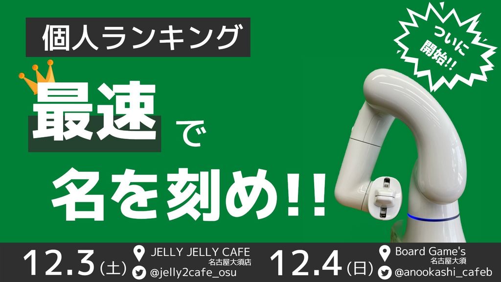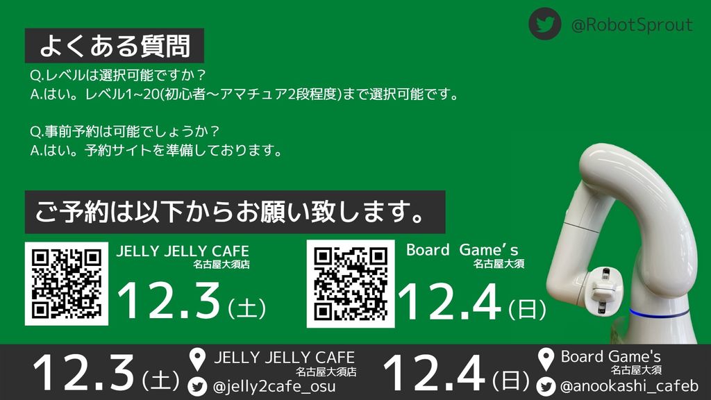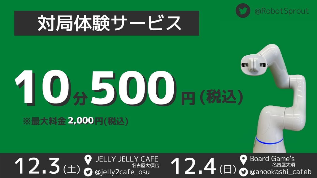 | 詳細内容 | 12/4限定!オセロロボットとオセロで対戦出来ます。 お一人様、ご友人、ご家族でもお気軽にお越しくださいませ。 |