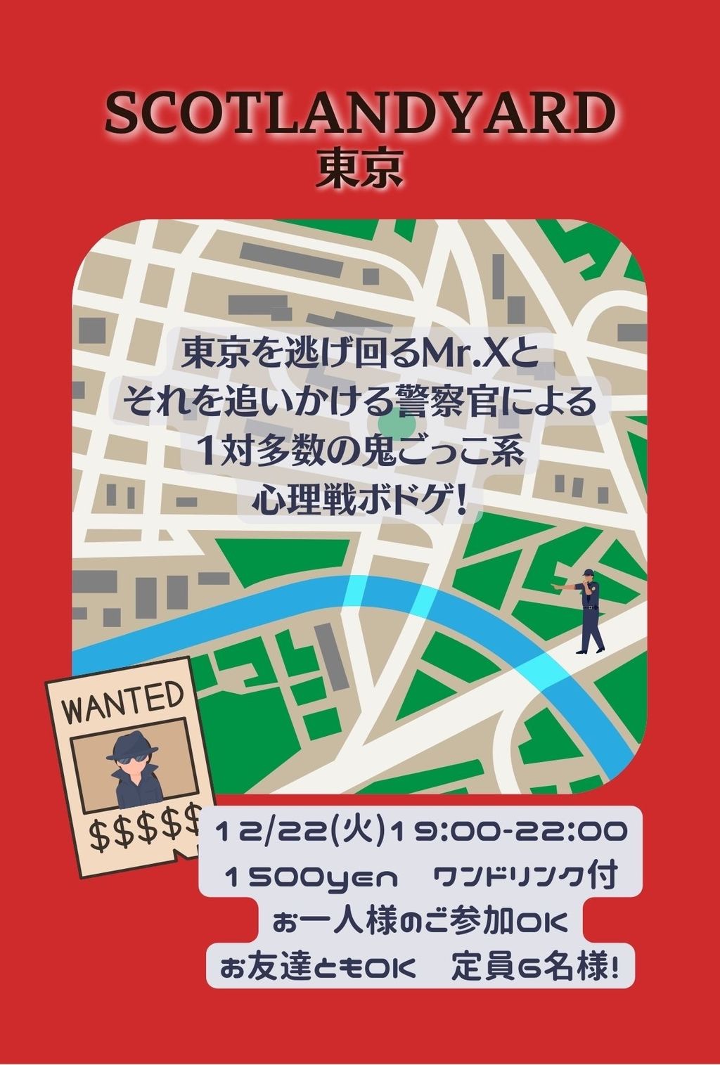 | 詳細内容 | 東京を逃げ回るMr.Xとそれを追いかける警察官による1対多数の鬼ごっこ系心理戦ボドゲ! 警察側はMr.Xの心理を読みながらどこにいるか予想できる楽しさが魅力! 初めての方も聞きながら遊べます! 🦹🏻♂『平日スコットランドヤード会』 |