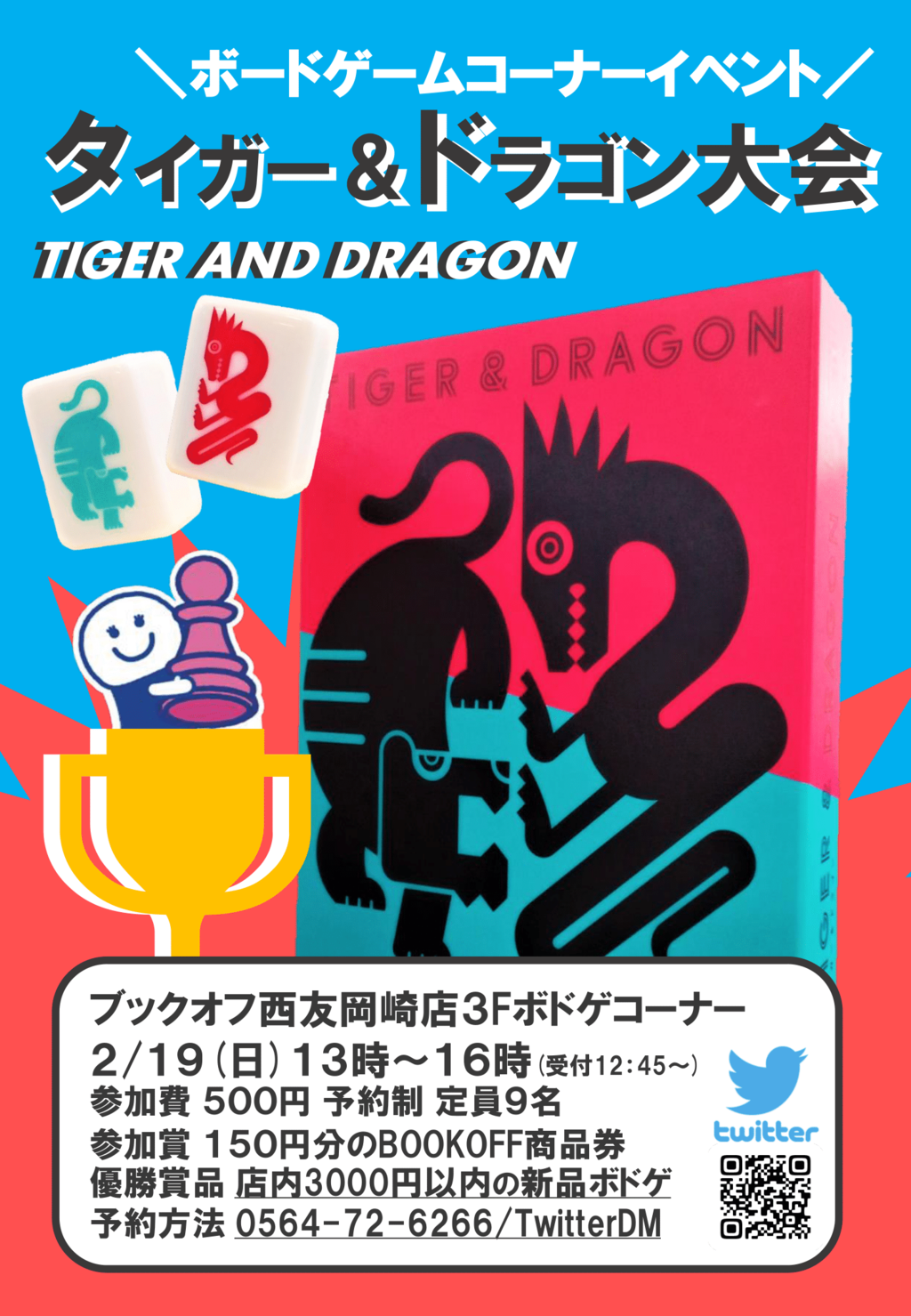 | 詳細内容 | 第1回『タイガー&ドラゴン大会』!【イベント詳細】 大会開催日:2023年2月19日(日)□時 間: 13:00~16:00(参加者12:45~受付) □定 員:予約制、定員9名 □場 所:BOOKOFF西友岡崎店3階ボードゲームコーナー □料 金:300円 □参加賞:300円分のBOOKOFFで使えるクーポン券 ★イベント概要 『タイガー&ドラゴン大会』 ▼タイムスケジュール 12:45~13:00 参加者受付 13:00~13:10 大会説明など 13:10~13:30 予選1(草原の戦い) 13:30~13:50 予選2(火山の戦い) 13:50~14:10 予選3(嵐の戦い) 14:10~14:30 予選4(洞窟の戦い) 14:30~14:40 集計(休憩) 14:40~14:45 予選結果発表 14:50~15:10 TOP4本戦(1対1) 15:10~15:30 決勝(1対1) 15:30~16:00 入賞者に賞品プレゼント ※スケジュールは前後する可能性があります。 ▼予選/準決/決勝共通レギュレーション 1.各試合、手番順はランダム/制限時間は20分 2.予選4試合を通して上位4名を決めます 3.組み合わせはスイスドローで決定 4.基本はタイガー&ドラゴンのルールに準拠 5.予選のみルール固定 ▼予選について 1位-5勝利ポイント 2位-3勝利ポイント 3位-1勝利ポイント 4位-0勝利ポイント 🐯制限時間20分で誰かが得点チップを10個 ex)得点チップ7個で2位が2人いる ▼TOP4戦/決勝について 🐲敗者脱落、1対1 ★プレイ中のマナーについて\アクションは声に出して伝えよう!/(1)プレイエリアは見やすくつくろう(2)受ける攻めるなどの行動は声に出そう(3)牌のシャッフルの仕方は各卓に任せます(4)不正行為はしないこと |