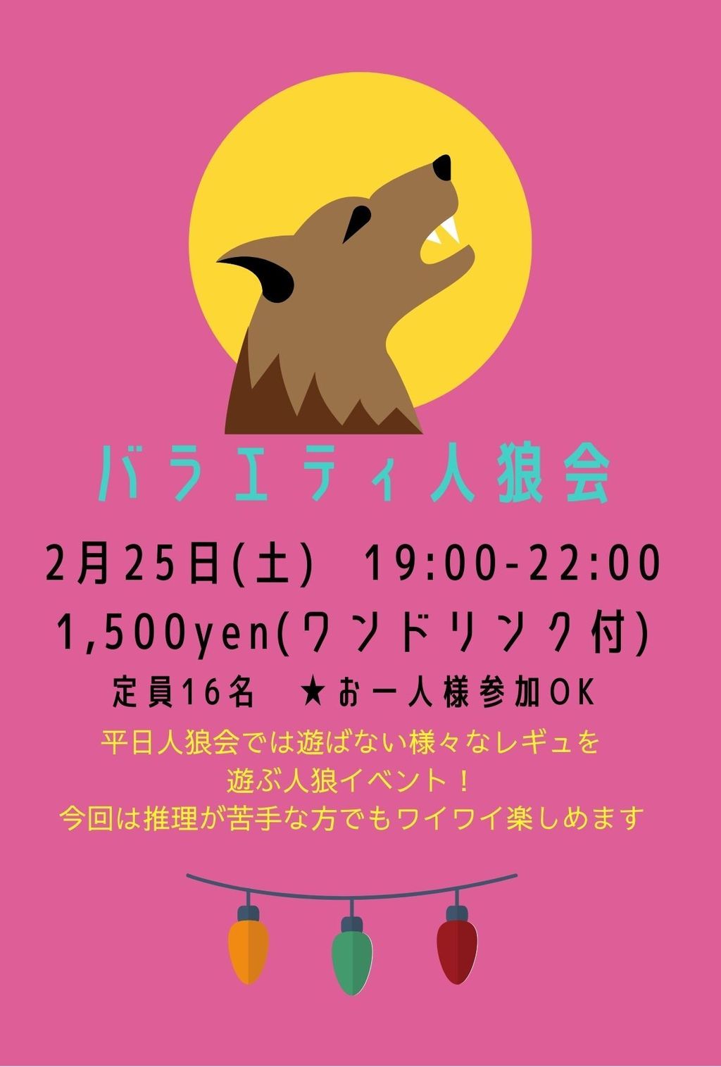 | 詳細内容 | 今月からの新イベント! 当店人気イベント「平日人狼会」では遊ばないレギュレーションで遊ぶ人狼イベント! 1回目はワイワイ遊べるパーティーゲーム系人狼のレギュを複数準備しました! 大人数でワイワイ楽しく遊びませんか? 🐺『バラエティ人狼会』【NEW!!】