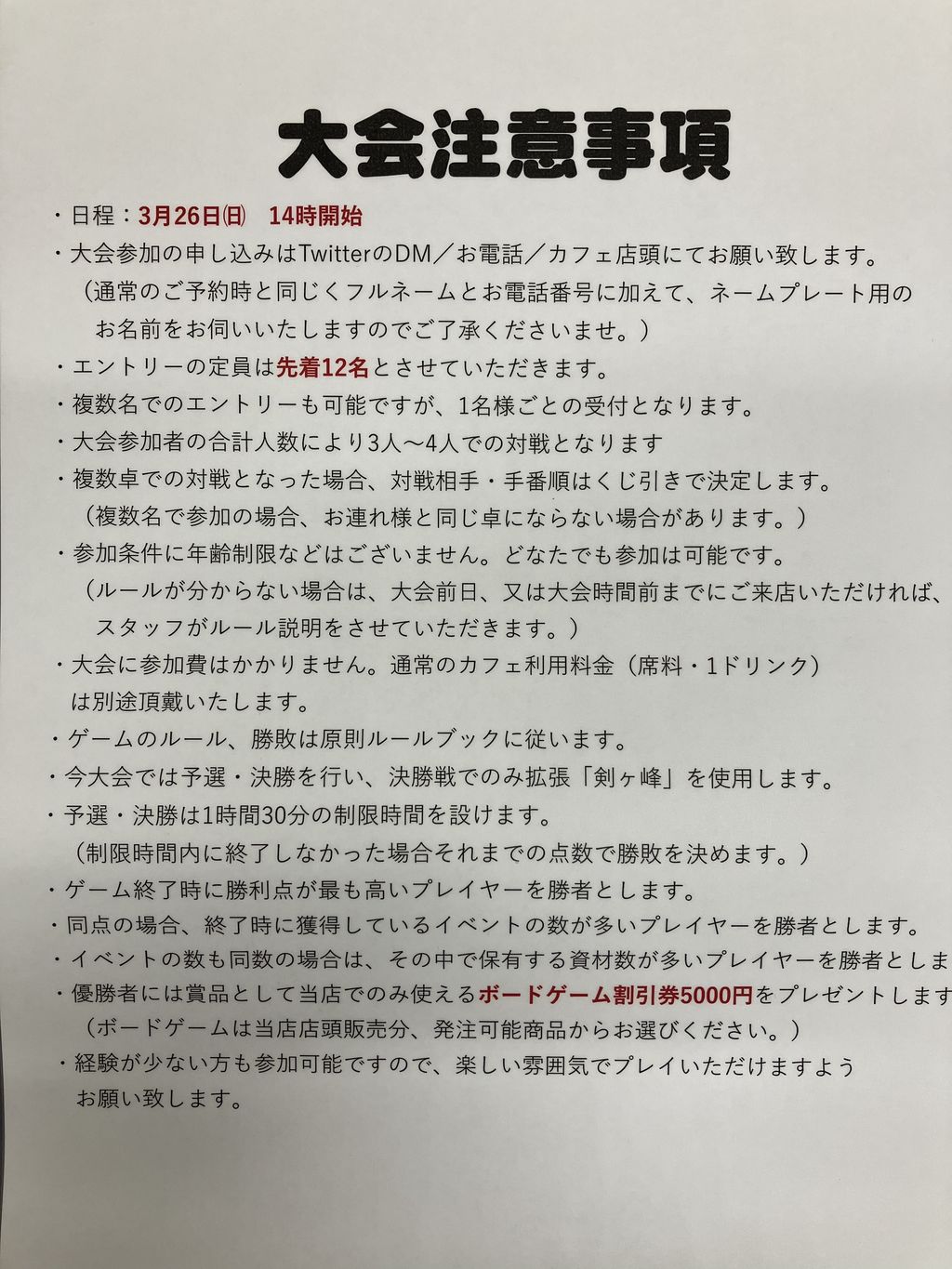 | 詳細内容 | 3月のボドゲ大会は『エバーデール杯』を開催します❗今回は拡張セット込みでの大会です❗参加人数に応じて予選、決勝を行います。予選は通常セットのみを使用し、決勝では拡張『剣が峰』を使用します。 今回予選、決勝では制限時間を1時間半とさせていただきます。制限時間内で終了しなかった場合は、制限時間までの点数で勝敗を決めます。 ゲーム終了時に獲得した点数で勝敗を決し、1位が決勝進出、決勝戦で1位となったプレイヤーが優勝となります。 勝利点が同数の場合、保有するイベント数→保有する資材数の順で順位を決定します。 そして今回の大会でもなんと❗ 優勝者に『当店のみで使える5000円分のボドゲ割引券』をプレゼントいたします❗ちょっと高額で手に入らなかったゲームをお得に手に入れるチャンスです❗ 大会参加費はボドゲカフェの利用料金となります。 エントリーはお電話かDMにて受け付けいたします❗カフェご利用時に直接スタッフに申し付けていただくのもOKです❗ 皆様のご参加お待ちしております❗ 電話 052-238-3361 Twitter https://mobile.twitter.com/bookoffbodoge |