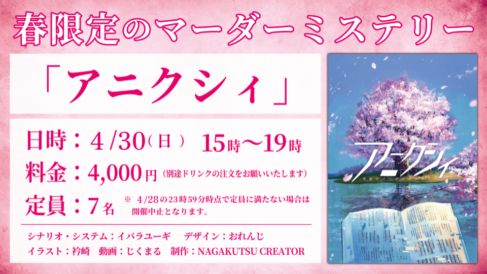 | 詳細内容 | ▼イベント参加予約▼各都道府県で1カ所のみ開催できる季節のマーダーミステリー! さあ、AsoVIVA JOKerで四季を感じていきましょう。 -------------------------------------------------------------------- 春を、夏を、秋を、冬を、激しく変化する環境を乗り越えるため、国中が次の季節への準備を行う。 ++++++++++++++ とある山奥にある、人口10万人程の大きな街。 アニクシィでは、春になるとサクラと呼ばれる桃色の花が咲き乱れる。 今回の舞台となるのは、そんなアニクシィで一番有名なとある薬品研究所。 -------------------------------------------------------------------- 【参加概要】 時間:約240分程度 対象年齢:小学校高学年以上 【クレジット】 -------------------------------------------------------------------- 【注意事項】 ●ゲームの性質上人数が必要なため、開催2日前の23:59時点で参加人数が集まらなかった場合は公演開催中止とさせていただきます。 ●遅刻や無断キャンセルをされますと公演が中止となり、参加者全員分の参加費をお支払いいただく場合がございます。必ずご連絡を頂きますようよろしくお願いいたします。 公演に関するご質問、ご不明・ご不安な点がございましたら、遠慮なくお問い合わせ下さい。 ※※※ゲームの性質上、ネタバレを固く禁止しております※※※ |