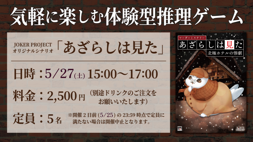 ▼イベント参加予約▼JOKER PROJECT初のオリジナルマーダーミステリー作品! 制作者:ちとく・ひさぎ(JOKER PROJECT) -------------------------------------------------------------------- 【ストーリー】 「ボク みた!シェフたおれた!はんにん!みつける!!」 この世界にひとつしかない、あざらしと触れ合える北極ホテル。 事件に関わる4人と1匹がたどり着く真実とは… -------------------------------------------------------------------- 【参加概要】 時間:約100分程度 対象年齢:小学校高学年以上 【ゲームの傾向】 -------------------------------------------------------------------- 【注意事項】 ●ゲームの性質上人数が必要なため、開催2日前の18:00時点で参加人数が集まらなかった場合は公演開催中止とさせていただきます。 ●遅刻や無断キャンセルをされますと公演が中止となり、参加者全員分の参加費をお支払いいただく場合がございます。必ずご連絡を頂きますようよろしくお願いいたします。 公演に関するご質問、ご不明・ご不安な点がございましたら、遠慮なくお問い合わせ下さい。 ※※※ゲームの性質上、ネタバレを固く禁止しております※※※ |