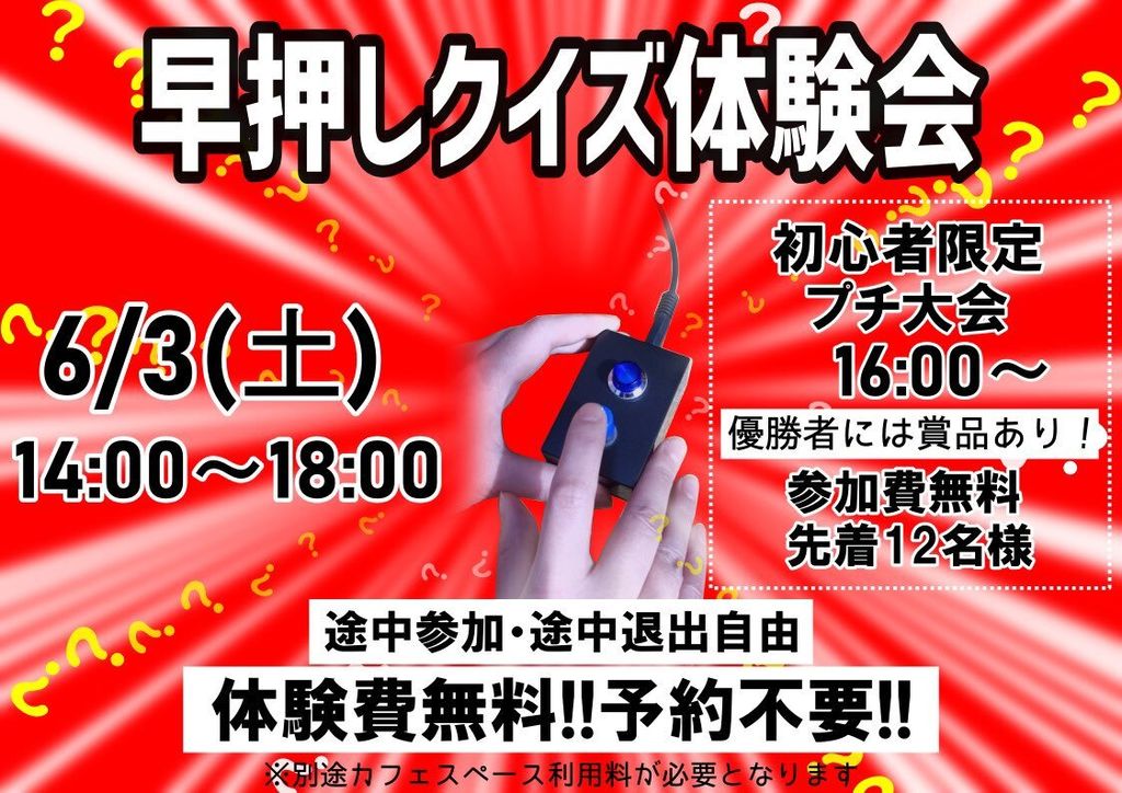 | 詳細内容 | 早押しボタンを触ってみたい !早押しクイズに興味はある!けど、やったことない…という方はぜひ「早押しクイズ体験会」に参加してみませんか?予約不要で当日体験可能です。 16時からは賞品ありの初心者限定プチ大会開催! クイズ番組の参加者気分になれるかも? 主催(敬称略) |
