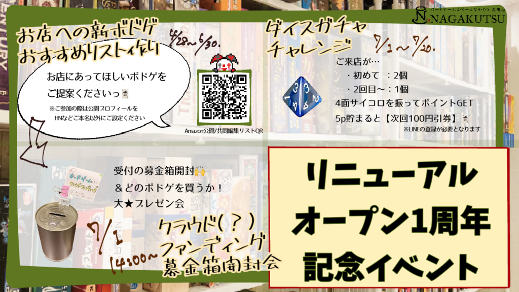 NAGAKUTSU 高槻店❗️ 【7/1(土)】に \リニューアルオープン1周年/ を迎えます〜🎉 これを記念してイベントを企画しましたので、 皆さまご参加くださると嬉しいです🃏 ①お店の新ボドゲおすすめリスト作り【4/28〜6/30開催】当店にあってほしい、おすすめのボードゲームを教えてください❗️ ▼公開/共同編集リスト🃏 amazon.co.jp/hz/wishlist/dl… ※ご参加時、ご自身のプロフィール公開設定にご注意ください ※店舗/店長宛にTwitter DMをくださっても構いません ②クラウド(?)ファンディング募金箱開封会【7/1、14時〜開催】ただいま受付で行っているクラファンの募金額を発表しますっ💰 ①で頂いたおすすめを候補に、募金でどれを買うべきかインタビューorプレゼンをお願いします! 採用された方にはプチプレゼントをお渡し予定🙌 ③ダイスガチャチャレンジ【7/1〜7/20開催】お会計時に実施中のポイント付与を、期間限定でダイスガチャに✨ 🎲はじめてご来店の方は1個 🎲2回目以降ご来店の方は2個 4面体サイコロを振って頂きポイントを付けます♪ 5ポイント貯まると【100円引きクーポン】GETですよ〜 ※LINE登録が必要です ご不明点は店舗連絡先までお問い合わせくださいませ! |