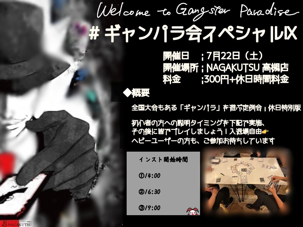 | 詳細内容 | □ギャングスターパラダイスとは ギャングスターパラダイス(略して"ギャンパラ")は正体隠匿ゲームです。 "交渉と恐喝のカードゲーム"と銘打っている通り、ギャングの幹部になりきって、相手を脅したり、攻撃したり、騙したり、時には協力して、勝利に必要な条件を満たしていきます。 一番最初に各々の勝利条件を満たした人がそのゲームを制します。 悪者を演じて遊ぶので、気軽に「悪いこと」をし合うコミュニケーションを楽しめます! 初心者の方向けに解説や説明(インスト)も行いますので、是非お気軽にお越しください! どんなゲームかご興味がある方は、Twitter、YouTubeなどで「ギャンパラ」と検索してみて下さい。 ★参考動画★ ・【公式】5分でわかるギャングスタ―パラダイス ルール説明 【ギャンパラ】 ・ギャングスターパラダイスChannel □開催日時 7月22日(土)、14:00〜21:30(時間帯での途中参加・退場自由) ★説明(インスト)開始時間(〜ゲーム時間目安) ➀14:00(〜16:20) ➁16:30(〜18:50) ➂19:00(〜21:30) ※インスト不要の方は、開始時間ちょうどにいらっしゃらなくても問題ございません。 都度の入れる卓にご参加頂く形となります □料金(300円+通常の休日時間料金) 【休日時間料金】 30分250円(※最初の1時間までは30分ごと500円) フリータイム2500円(学割2000円) ※4時間以上は自動でフリータイム移行となります ※ボードゲームは、開始前後に自由に遊んで頂けます □場所 ボードゲームスペース『NAGAKUTSU』高槻店 □その他詳細・予約 下記TwiPlaよりご確認くださいませ |