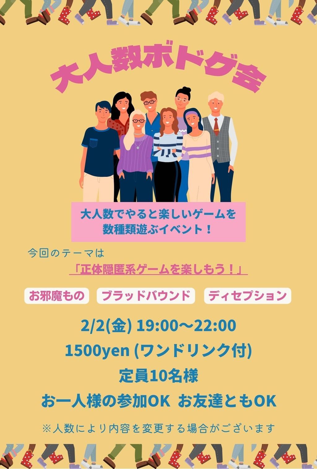 | 詳細内容 | 大人数で遊んだほうが面白い!というボドゲを数種類遊べるイベント! 初めての方も!ボドゲが好きな方も!皆でワイワイ盛り上がりましょう! 👨👩👧👦大人数ボドゲ会 |