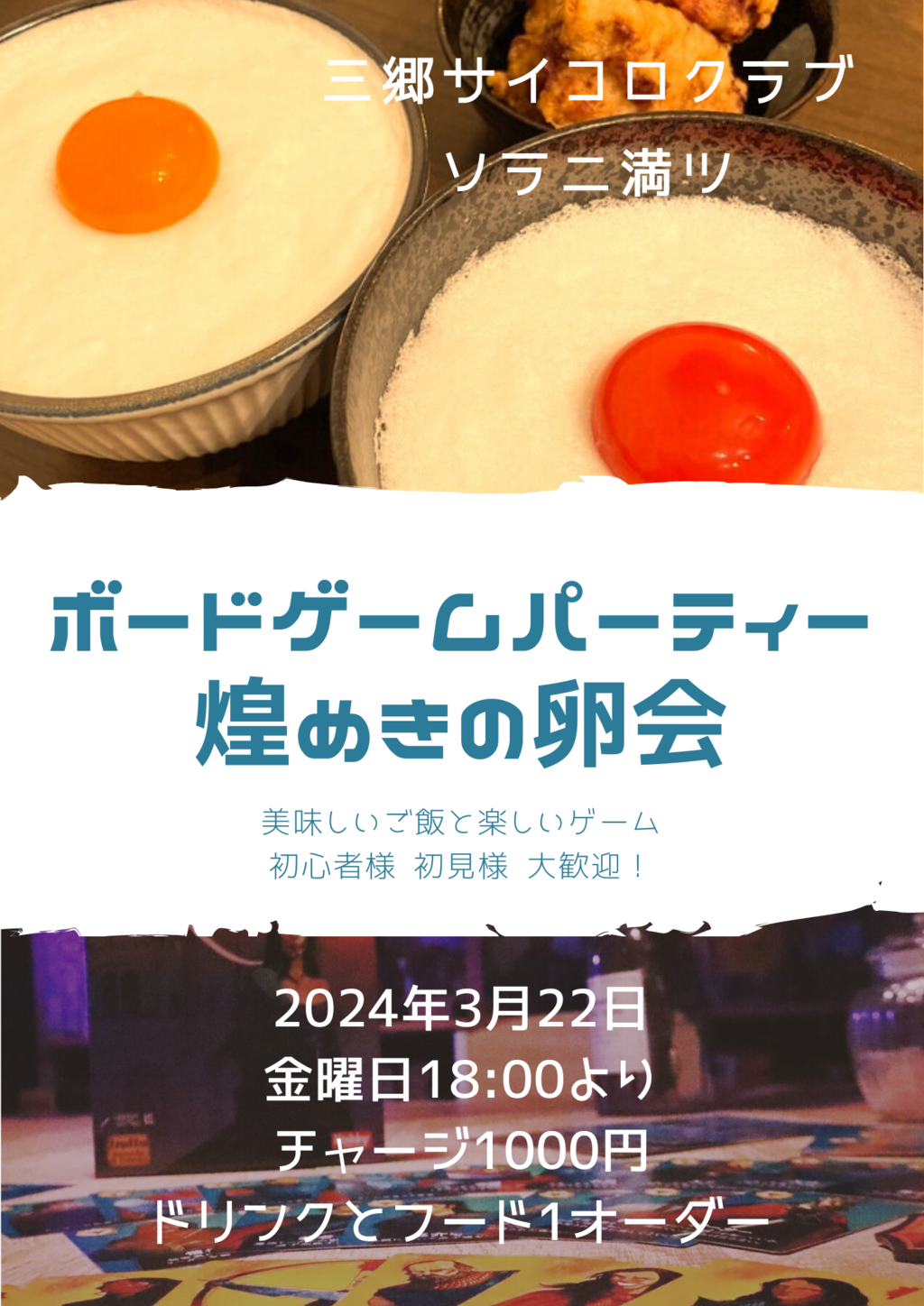 | 詳細内容 | 三郷サイコロクラブとソラニ満ツの合同イベント「ファラ満ツ」がスタートします 今回は東向商店街にあります「煌めきの卵」さんにてボードゲームパーティーを開催します 美味しいご飯を食べながら楽しいゲームで遊びましょう 途中参加OK! チャージ1000円 ドリンクとフードの1オーダーお願いします |