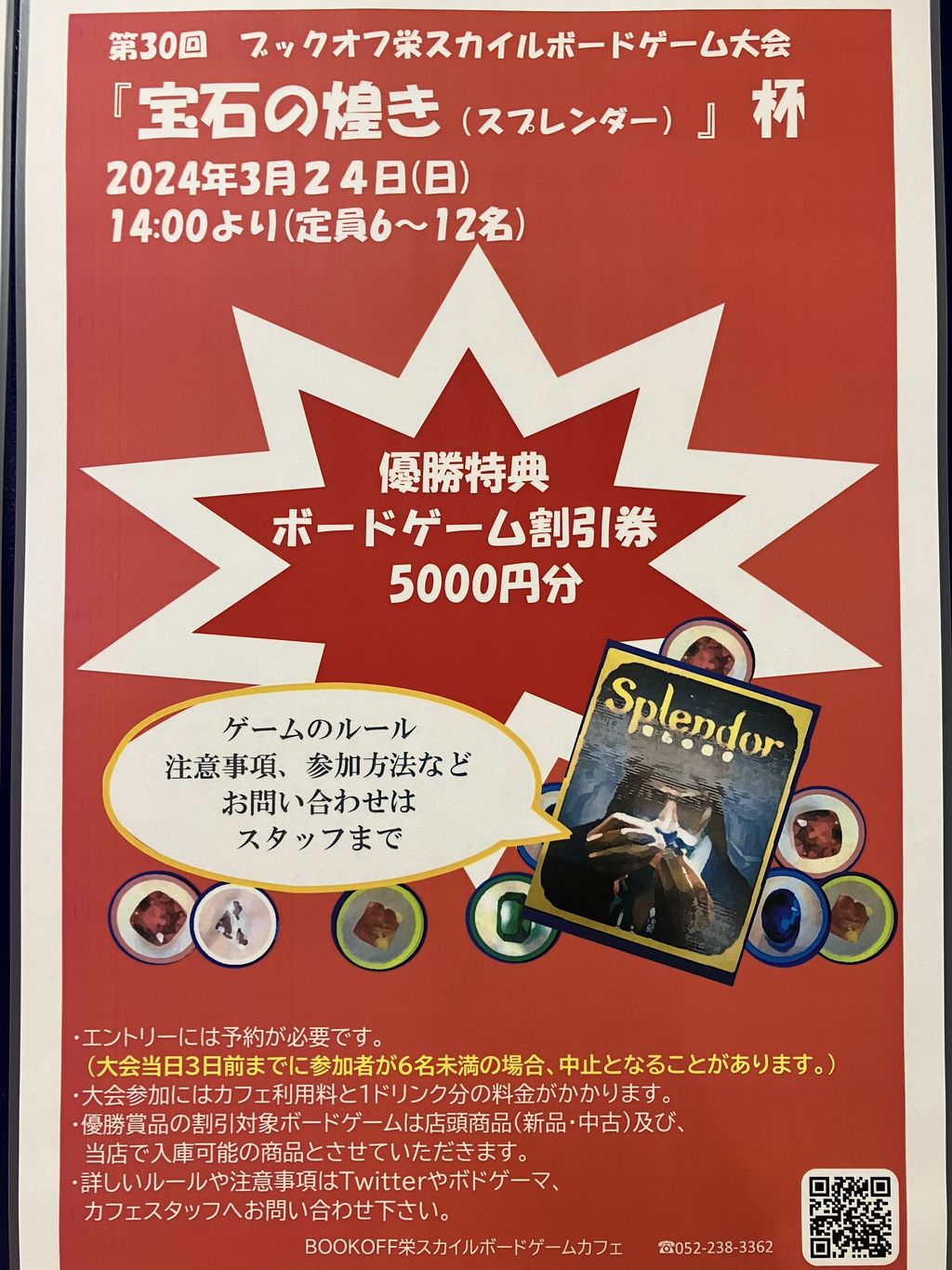 大会当日の3日前までに大会参加のご予約が6人以下の場合、大会は中止となりますのでご了承くださいませ。 どの卓になるかは当日のくじ引きによって決まります。 15点獲得したプレイヤーが1人でもいればゲーム終了のトリガーとなり、初手プレイヤーの手前のプレイヤーまで手番を行い、点数が多かったプレイヤーを勝者とし、予選では3卓で行った場合1位のみ、2卓で行った場合上位2位のプレイヤーまでが決勝進出となります。 勝利点が同数の場合、説明書に基づき『宝石カードの枚数→手元に残った宝石トークンの少ない』プレイヤーを勝者とします。 そして今回の大会でもなんと❗ 優勝者に『当店のみで使える5000円分のボドゲ割引券❌1枚』をプレゼントいたします❗ちょっと高額で手に入らなかったボードゲームをお得に手に入れるチャンスです❗ 大会参加費はボドゲカフェの利用料金となります。 エントリーはお電話かX(旧Twitter)DMにて受け付けいたします❗カフェご利用時に直接スタッフに申し付けていただくのもOKです❗ 皆様のご参加お待ちしております❗ 電話 052-238-3361 X(旧Twitter) https://mobile.twitter.com/bookoffbodoge |