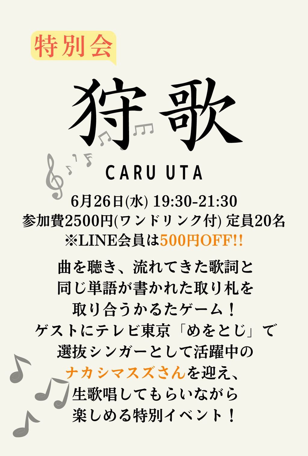 | 詳細内容 | 2.5周年を記念し特別バージョンでの開催が決定! 流れてきた曲の歌詞と同じ単語のカードを取るかるたゲーム! 今回はテレビ東京「うたごえプロジェクト"めをとじ"」さん協力のもと開催する特別版! 他にも色々な工夫満載で超楽しい2時間になること間違いなし! 🎶特別狩歌会 |