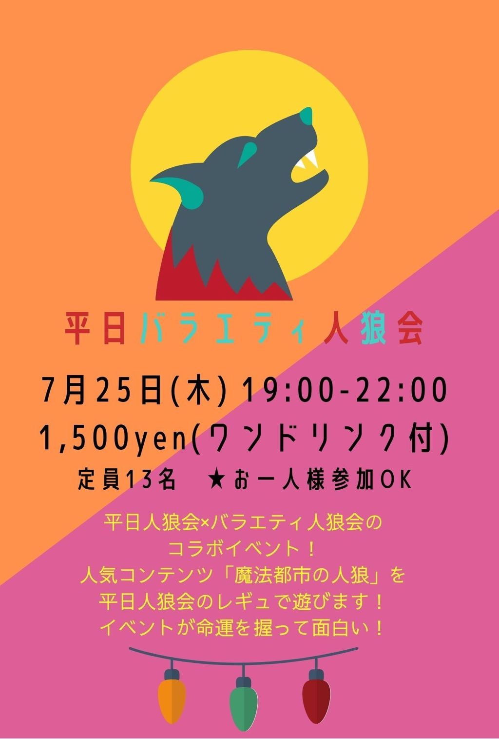 | 詳細内容 | 開店当初から開催している「平日人狼会」と特殊レギュレーションを楽しむ「バラエティ人狼会」のコラボイベント! 「バラエティ人狼会」の人気コンテンツで追放される度にイベントが発生する「魔法都市の人狼」を「平日人狼会」のレギュで遊びます ! 初めての方も大歓迎!平日人狼会のルールに慣れている方は比較的理解しやすくなってます! 🐺平日バラエティ人狼会 |