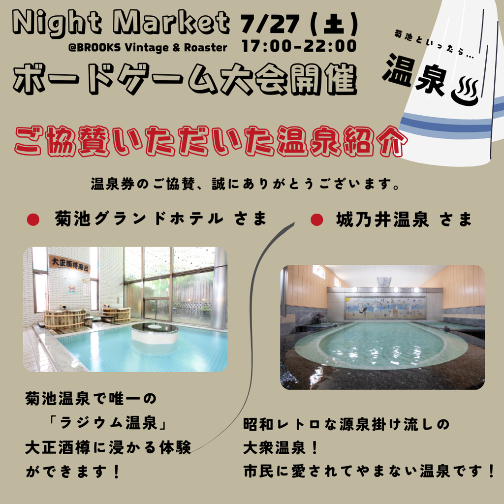 | 詳細内容 | \ 7/27(土) ボードゲーム大会開催 / 7月毎週土曜夜開催中の「Night Market @BROOKS Vintage & Roaster 」にてボドゲ大会を開催します! @brooks_vintage_roaster 優勝景品には、選べるボドゲプレゼントあり🎁 ⚪︎タイムテーブル 18:00~「クラスク」トーナメント戦 定員 14人8歳以上推奨 プレイ時間10分以内 勝ち上がり戦) 20:00〜「カタン」 定員6人8歳以上推奨プレイ時間70分 ⚪︎ゲーム紹介 「クラスク」は、 人気急上昇の磁石で操るスリリングなホッケーゲーム!ルールも簡単で初心者でもすぐに上達して楽しめます! 「カタン」は、 多くの愛好家の定番ボードゲームとして、初心者から上級者まで愛されるゲームです! カードや駒の移動、交渉などボードゲームの醍醐味を味わえるゲームです。カタンからボードゲームにのめりこむ人続出! ⚪︎体験 17:00〜22:00の間、当店でよく遊ばれている20種類のボードゲームを体験できます。 大会に参加しない方でもボードゲームを楽しむことができます!! 初心者にも優しく教えますので、安心してください。 駄菓子食べながらの見学もOK! ⚪︎参加費 ・大会参加費 1000円 駄菓子食べ放題付き ・体験ボードゲーム 500円 駄菓子食べ放題付き ⚪︎大会参加特典 参加者全員 菊池温泉ペア入浴チケットプレゼント♨️ 各ゲーム優勝者は、2000円相当の選べるボードゲームプレゼント🎁 2位、3位入賞者は、ボードゲーム喫茶しんきんぐ・BROOKS Vintage & Roasterで使える割引券・ドリンク券プレゼント🎁 ⚪︎イベント協賛 本企画は、菊池温泉の名湯2軒より、ご協賛をいただきました。心よりお礼申し上げます。 ・城乃井温泉さま @shironoiryokan 入浴可能時間 6:00〜23:00 ・菊池グランドホテルさま @kikuchigrandhotel 入浴可能時間 11:00〜15:00 昭和レトロな源泉掛け流しの大衆温泉で、市民に愛されてやまない城乃井温泉さま、 菊池温泉で唯一のラジウム温泉で大正酒樽に浸かる体験ができる菊池グランドホテルさま、 どちらも最高の温泉です!! \ 大会参加者全員にどちらかの温泉のペアチケットをプレゼントいたします / ⚪︎申込 お申し込みは、 ボードゲーム喫茶しんきんぐへDMお願いします @boardgamecafe_thinking ⚪︎定員 クラスク14人 カタン6人 予約がなくても、当日空きがあれば飛び入り参加もOKです🙆♀️ ⚪︎開催場所 BROOKS Vintage & Roaster 菊池市亘44-3ルミエール壱番館101 何かわからないことがあれば、いつでもご連絡くださいね🎲 #ボードゲーム #gamenight #ボードゲームカフェ #ボドゲ #ボドゲ部 #ボドゲ初心者 #ボードゲーム好きと繋がりたい #デジタルデトックス #思考力 #考えるって楽しい #知育 #コミュニケーション力 #遊べるカフェ #熊本喫茶店 #菊池市 #菊池カフェ #菊池温泉 #湯あがりスポット #ボードゲーム喫茶しんきんぐ #しんきんぐ |