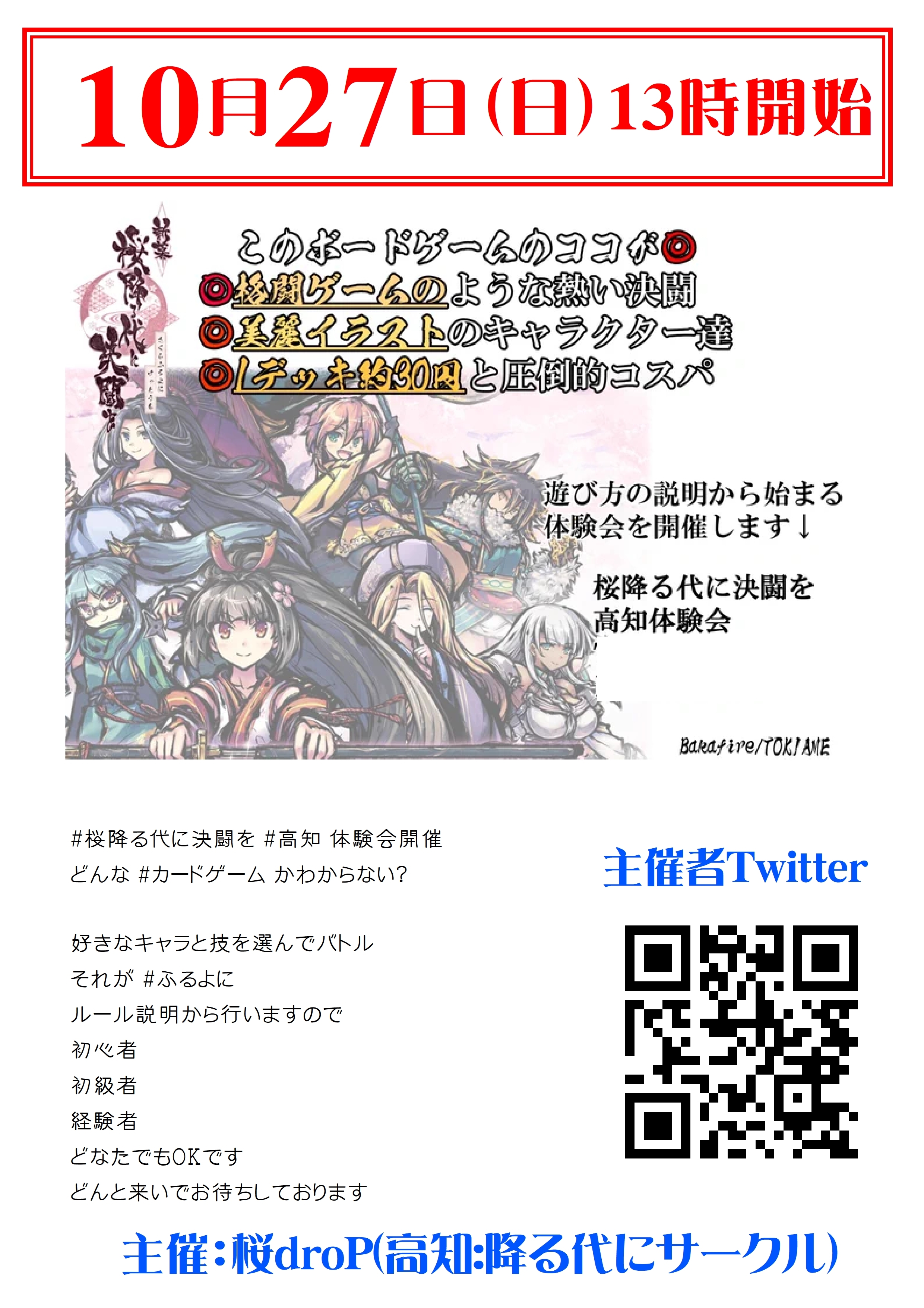 | 詳細内容 | 10/27(日)13時より 「桜降る代に決闘を」体験会を開催します。 ルール説明から行いますのでご興味ありましたら 是非ご参加ください。 入退場自由ですので、お好きな時間にいらしてください。