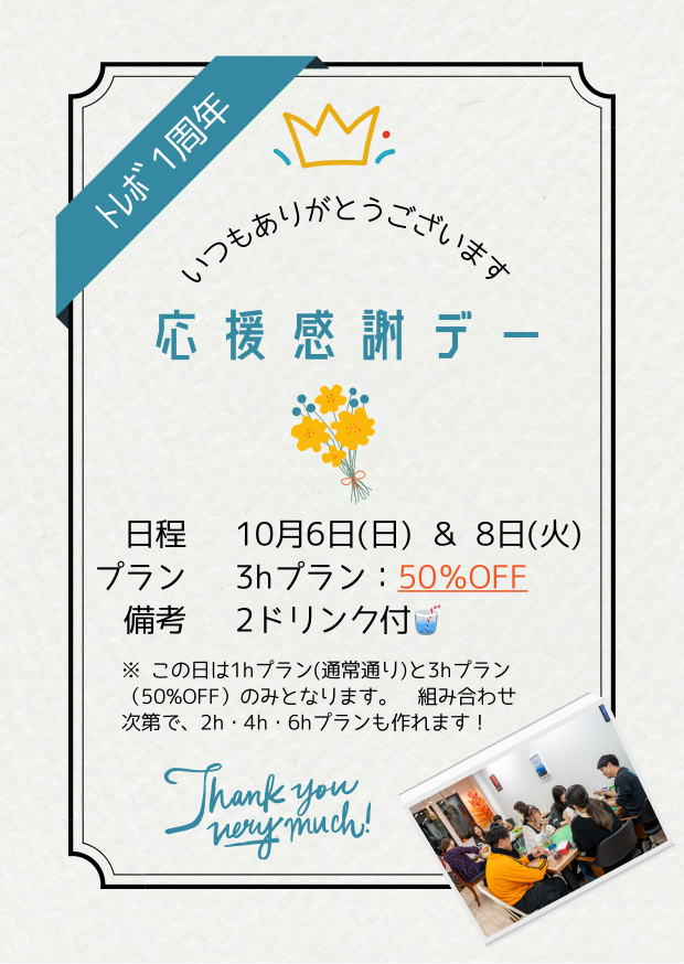 | 詳細内容 | 福岡ボードゲームカフェ Treasure Box(トレボ)は、2024年10月6日で1周年を迎えます! そこで、2年目の営業初日と2日目は、これまでご愛顧いただいたお客様への感謝の意を込め、 「応援感謝デー」と題して、3時間プランの料金を【50%OFF】にいたします。