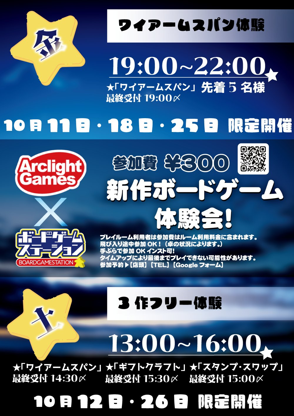 【開催スケジュール】 🌙 【金曜の部】 ☀️ 【土曜の部】 各部、飛び入り途中参加OK!(卓の状況によります。) 【参加費】 【参加受付】※開催5分前まで受付しております★店頭 ★TEL 048-783-7828 ★Eメール ※「Eメール」でご予約の際は、件名を「新作ボードゲーム体験会参加予約」として、お名前(フルネーム)・電話番号(携帯)・参加希望日を明記の上、omiya☆bg-st.net(☆は@)まで送信してください。 ★Googleアンケートフォーム(https://forms.gle/9BT12LNHgZC7EWj) 「興味はあるけど難しそう…」「ボードゲーム普段やってないし不安…」ご心配なく!! 気に入ったら当店で予約/購入してね!💁 💁