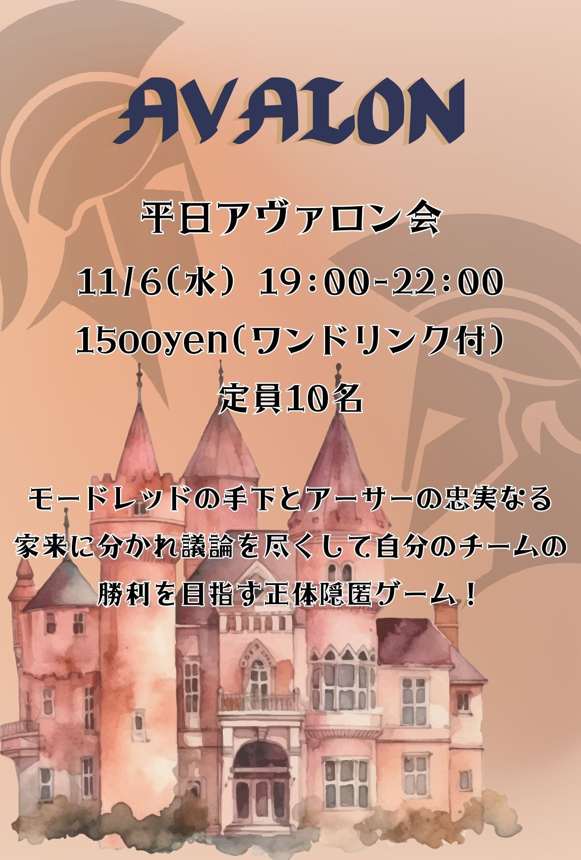 | 詳細内容 | 前回好評のイベントが8カ月ぶりに復活開催! モードレットの手下とアーサーの忠実なる家来に分かれて遊ぶ正体隠匿系ゲーム! 当店で人気のボドゲでファンも多いです! ⚔️平日アヴァロン会 ※ボドゲーマからの予約は受け付けておりません。参加希望者は上記の申し込み方法から必ずお申し込み下さい。