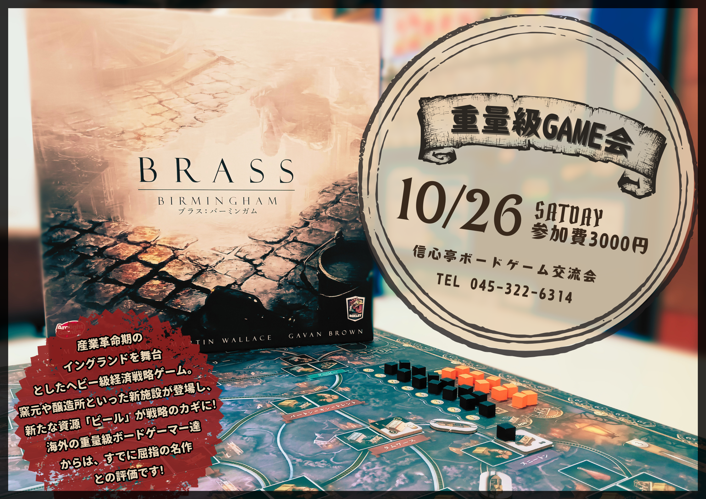 1770年からの産業革命期のイギリスを舞台とした経済戦略ゲーム。 運河の時代から鉄道の時代への移り替わりといった世界観を楽しむもよし。 資源の産出や輸送ネットワーク形成といった戦略を楽しむもよし。 世界のボードゲームフォーラム「BoardGameGeek 」で2024年4月現在、堂々の1位である本作を是非ご体験下さい! 受付時刻:10月26日(土) 13時~ ※途中退出・休憩可能 定員:4名 参加費:3000円 予約:推奨 店頭もしくは電話(045-322-6314)で受付 タイムスケジュール: 13時00分:参加受付 13時15分:遊び方説明→ゲーム開始 20時30分:イベント終了 【途中参加について】 定員に空きがあれば途中参加も可能ですが、1ゲームの時間が長いためお待ち頂く事になります。 イベント当日に途中参加をご希望の場合は、必ずお電話でご確認下さいませ。 【その他当店イベント情報は↓から】 |