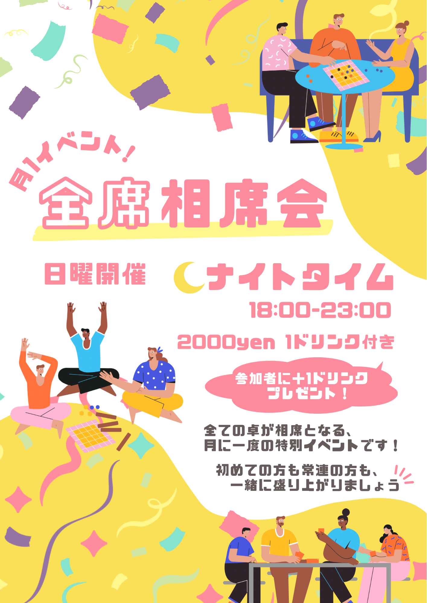 【イベント参加者は2ドリンク無料!】通常の1ドリンク無料に加えて、さらに1ドリンクご注文いただけます! 10/27(日)18:00〜は『全席相席会』を開催! 全ての卓が相席卓になり、ボードゲームを楽しみ尽くす時間! 初めての方も常連様も大歓迎! イベント参加者は2ドリンク無料🍹 初めての方には、ルール説明や進行等をスタッフがサポートするので安心してご来店下さい🙌 予約なしでも参加可能! 皆様のご来店お待ちしています! 日時2024/10/25(金) 18:00〜 受付開始 場所茨木ボードゲームカフェComorebi 大阪府茨木市舟木町4-1 第2奥村ビル 2階
