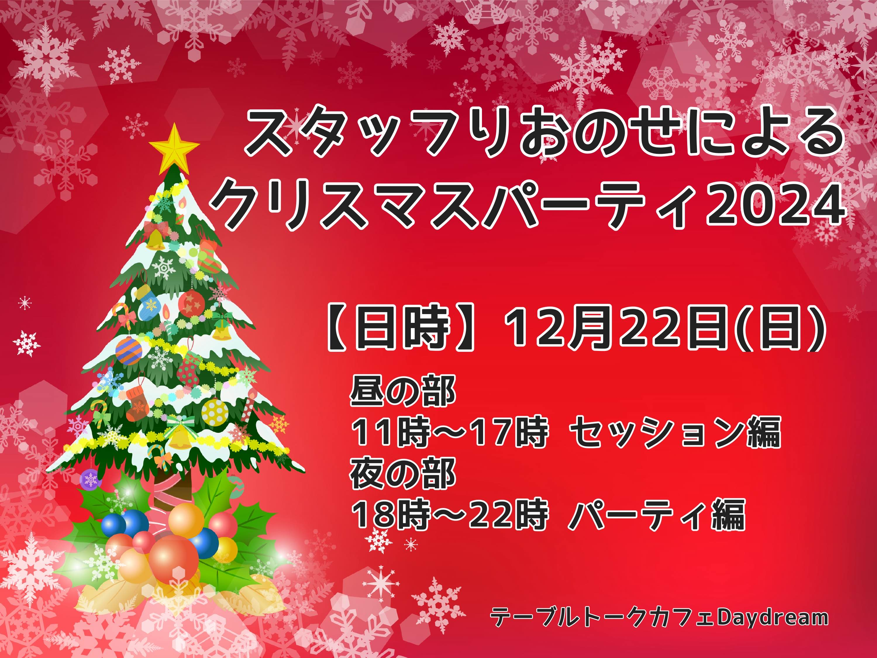 皆さまいつもお世話になっております。 今年もスタッフりおのせによるクリスマスパーティを開催します! 1年に1度のクリスマス!Daydreamでパーティしませんか? 昼のセッション編では、各GMが持ち寄った選りすぐりのクリスマスセッションを。 夜のパーティ編ではクリスマスならではのプレゼント交換会を! パーティメニューのお料理も出ます!(その他イベント用意しております) どちらかの部だけの参加も歓迎です。 ぜひ奮ってご参加ください! 【開催日】 12月22日(日) セッション編 11時~17時 パーティ編 18時~22時 【セッション編 開催セッション】 クトゥルフ神話TRPG 「creep」 KPオキ ビギニングアイドル「Present for You!」 プロデューサーそらまめ ウタカゼ「風鳴き谷に眠る楽譜」GMおせいぼ インセイン「クローズドサークルクリスマス」GM一乃瀬友樹 【パーティ編 タイムテーブル】 18:00 集合 18:30 プレゼント交換会 19:30 Daydream からのプレゼント争奪戦 20:30 TRPGクイズ大会 22:00 閉会 常設イベント スタッフりおのせ考案オリジナルゲーム「クリスマス攻防戦!」 途中参加途中退室OKです。 (内容に変更の可能性がございます) 【料金】 セッション編 昼パック4000円(23歳以下3000円) パーティ編 夜パック3000円(23歳以下2000円)+お食事代700円 セッション編+パーティ編 1日パック6000円(23歳以下4000円)+お食事代700円 【参加方法】 Daydream カレンダーより参加希望のコメントをお願いいたします。 [セッション編] ビギニングアイドル「Present for You!」 プロデューサーそらまめ [パーティ編] テーブルトークカフェDaydream |