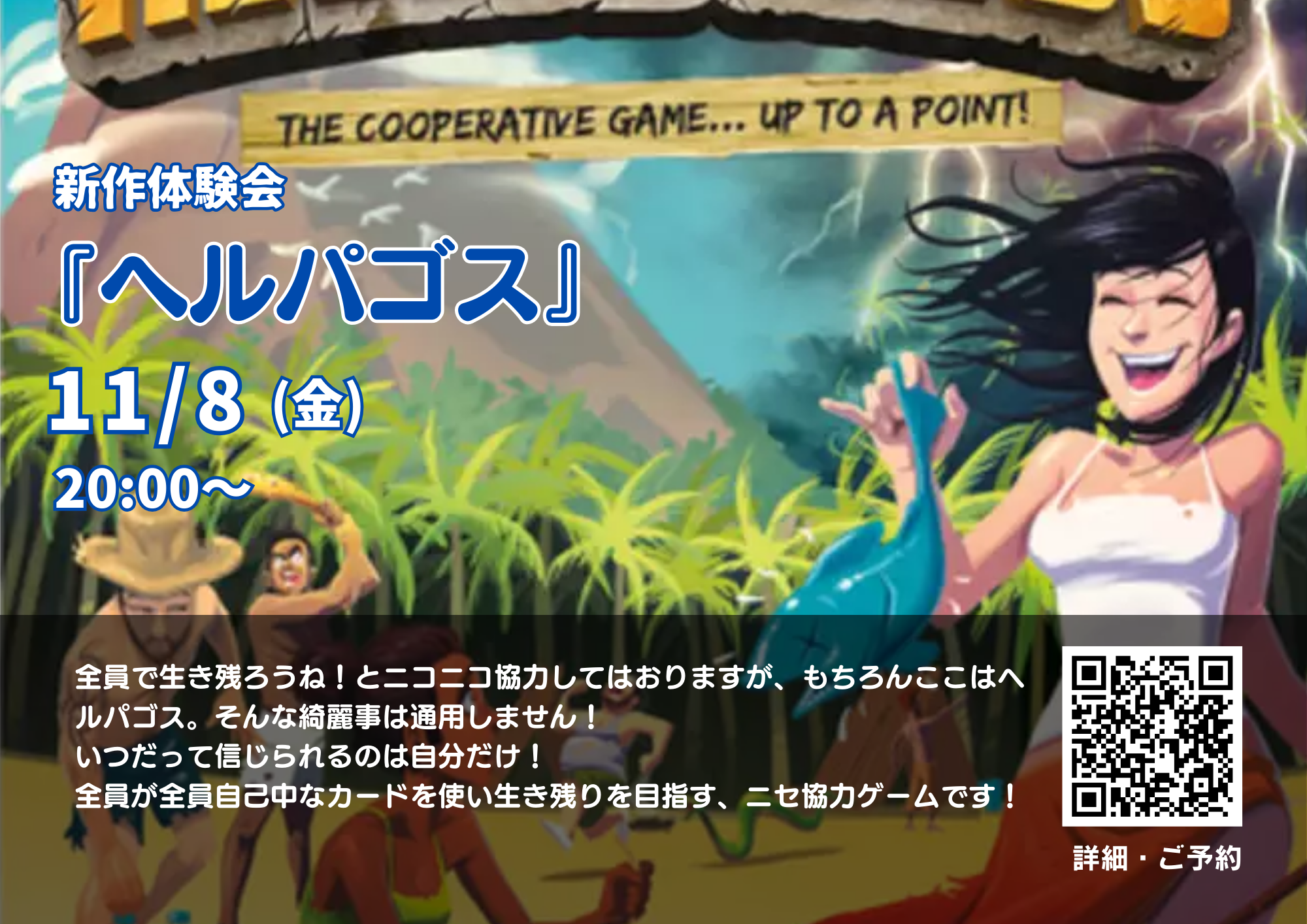 | 詳細内容 | 最新のボードゲーム、話題のボードゲームを体験するイベント、サイコロ堂シーサイドの新作体験会です。 全員で生き残ろうね!とニコニコ協力してはおりますが、もちろんここはヘルパゴス。そんな綺麗事は通用しません! プレイ後はもう一度同じゲームを遊ぶもよし、相席で別のボードゲームを遊ぶもよし、のゆったりした会となります。 参加は下記のURLから! ![]() |