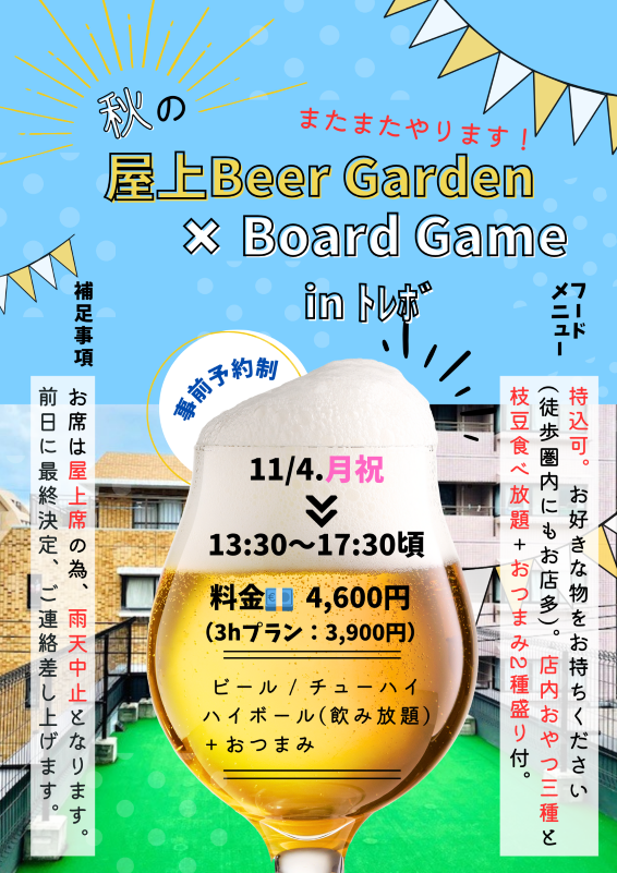 | 詳細内容 | Treasure Box(トレボ)は、「ビル屋上の独占利用権」を持っています🏢 せっかく「屋上」という場所がありながら、なかなか活用する良い案がなかったのですが、この度、気温も落ち着き、過ごしやすくなる時期だからこそできるイベントとして、ボードゲームカフェで『ビアガーデン企画』に挑戦する事にしました🍺 10月初開催に続き、好評の為再登場!!今年最後の「ビアガーデン」企画です🍻 (※天候に左右されるため、中止となる場合がございます。予めご了承ください)