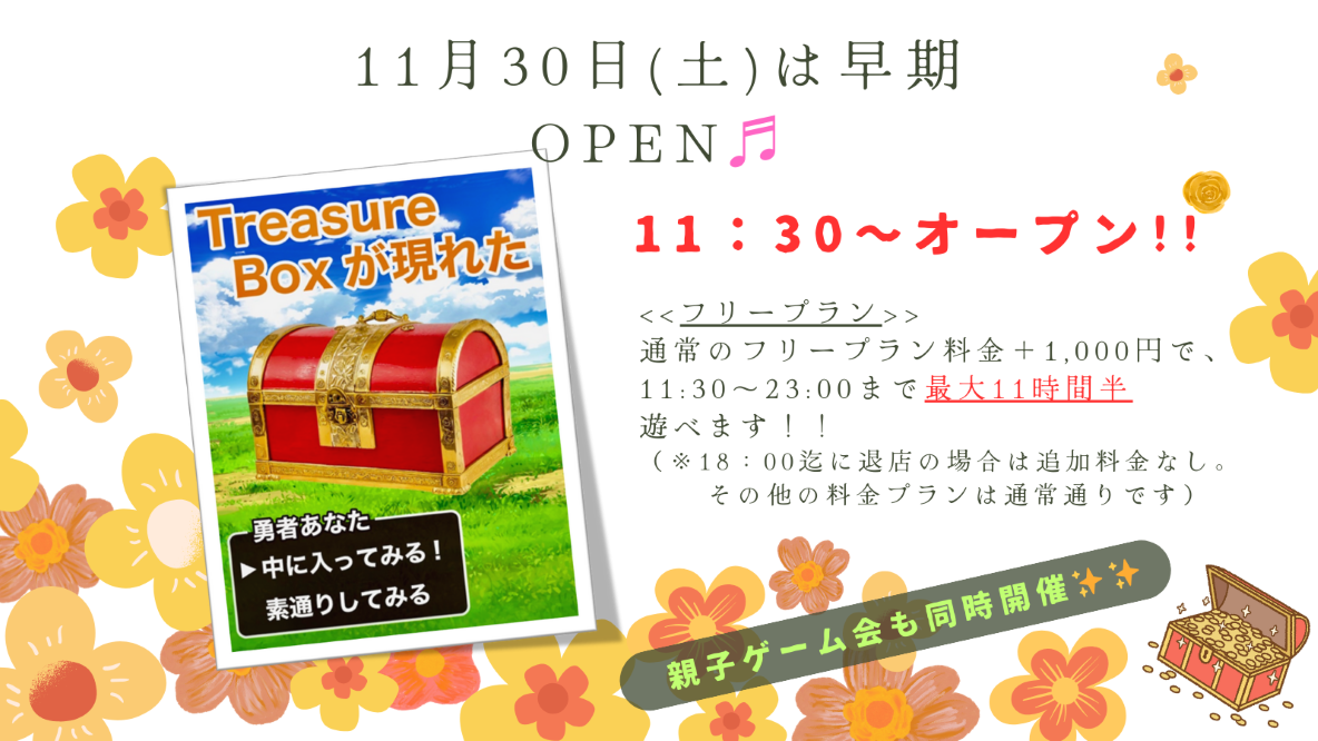 | 詳細内容 | 11月30日(土)は午前中からの早開けが決定!!