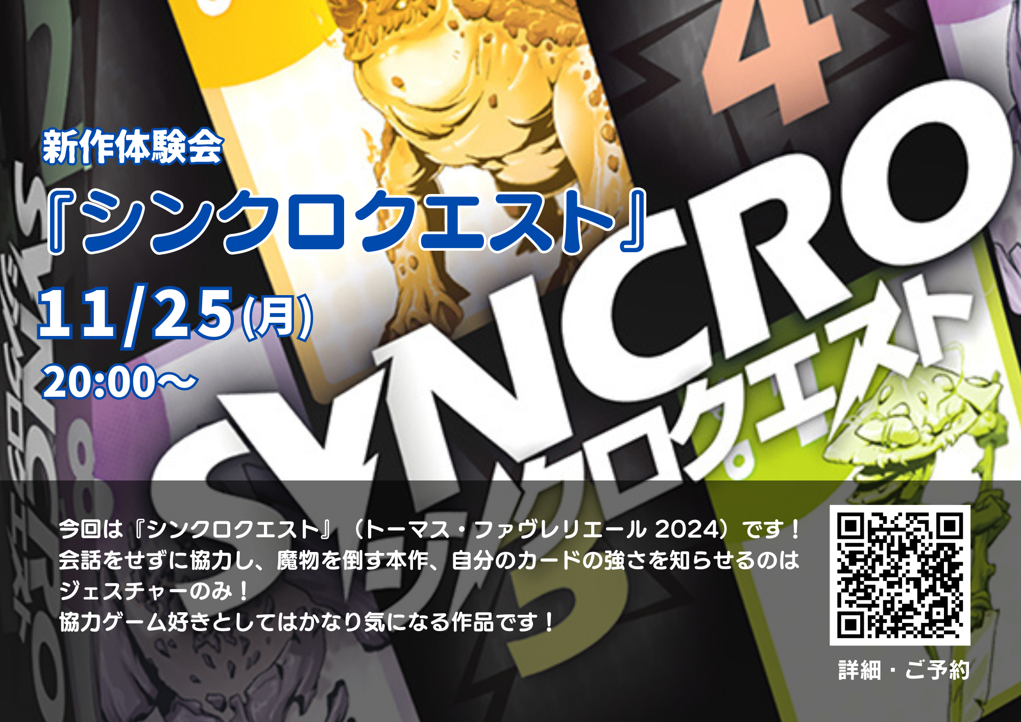 | 詳細内容 | 最新のボードゲーム、話題のボードゲームを体験するイベント、サイコロ堂シーサイドの新作体験会です。 会話をせずに協力し、魔物を倒す本作、自分のカードの強さを知らせるのはジェスチャーのみ! 協力ゲーム好きとしてはかなり気になる作品です! プレイ後はもう一度同じゲームを遊ぶもよし、相席で別のボードゲームを遊ぶもよし、のゆったりした会となります。 参加申し込みはこちら↓