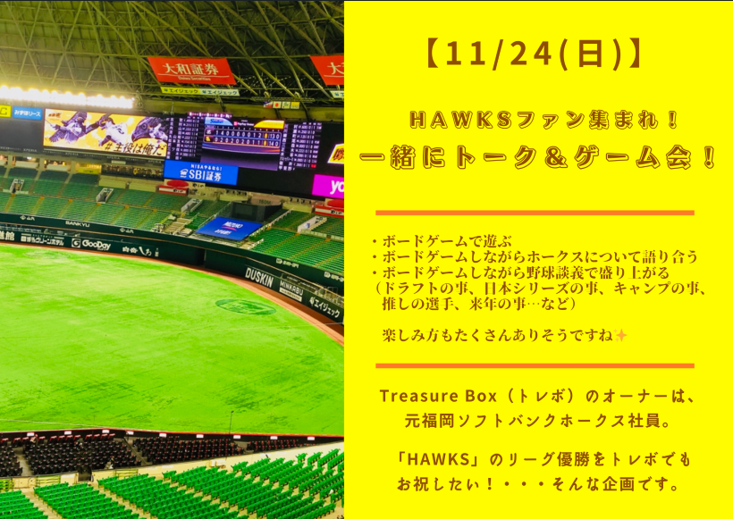 HAWKS好き(野球好き)&ボードゲーム好きな皆さまとお会いできるのを楽しみにしています!! |