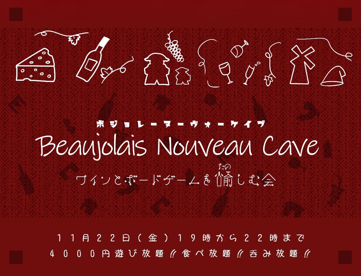 | タグ | ボードゲーム、初心者歓迎、どなたでも、初参加歓迎、途中参加OK、食べ放題、呑み放題、ボジョレーヌーヴォー |