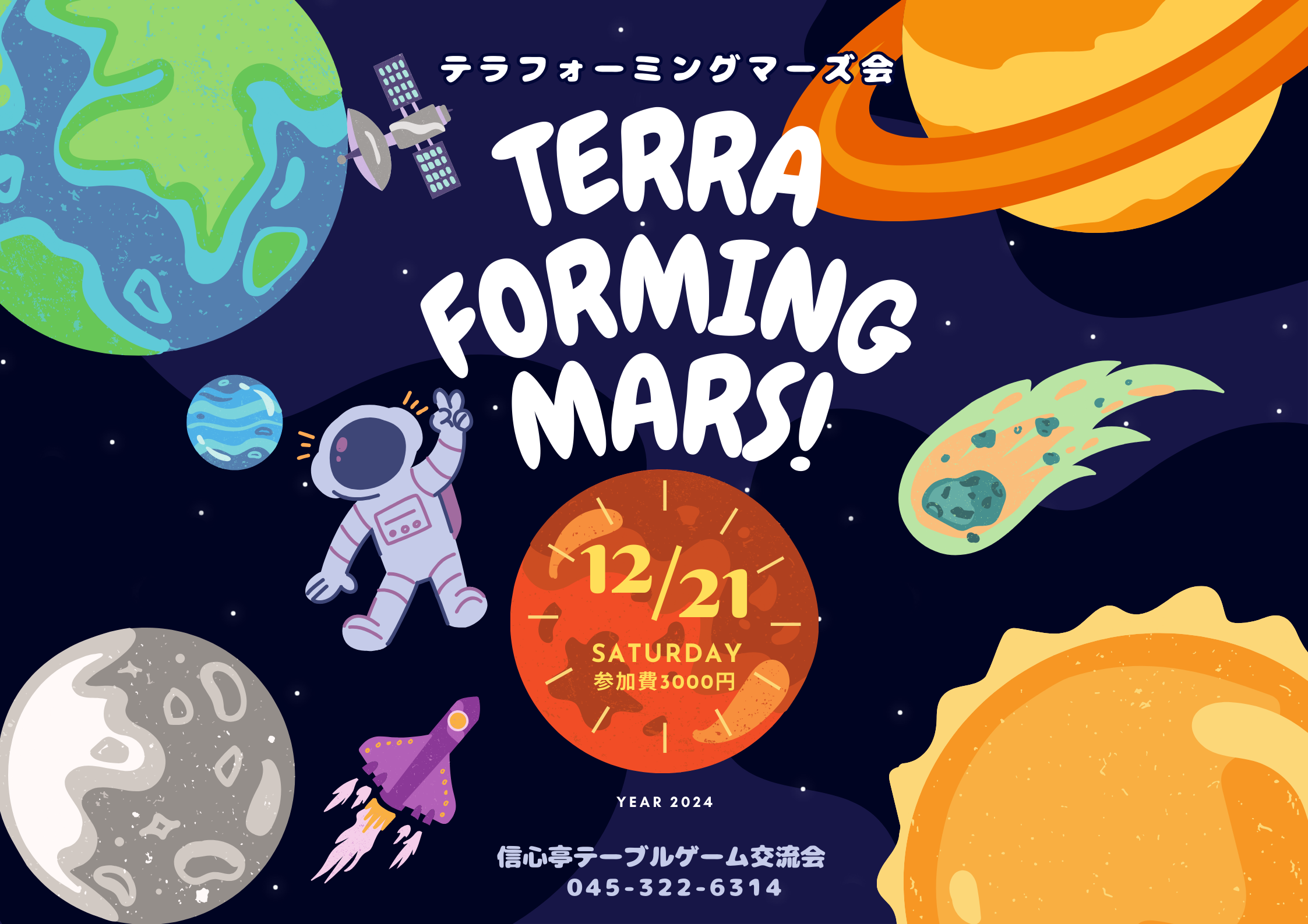 | 詳細内容 | ※2024年9月よりイベント予約機能が追加されていますが ※当ページでの予約受付を行っておりません ※予約方法につきましては当ページ下部の詳細をご確認下さい 「まずは遊んでみよう!」をコンセプトに、ボードゲームを遊んだ事がある方もそうでない方も気軽に参加できるイベントとなっております。 お一人様でも複数名様でも、集まって相席で一緒にゲームを楽しみませんか? 使用するゲーム:【テラフォーミングマーズ】 ボドゲーマサイト内の紹介・レビューページ 基本セット:https://bodoge.hoobby.net/games/terraforming-mars 拡張「プレリュード」:https://bodoge.hoobby.net/games/terraforming-mars-prelude 1ゲーム当たりのプレイ時間 : 120分前後の重量級