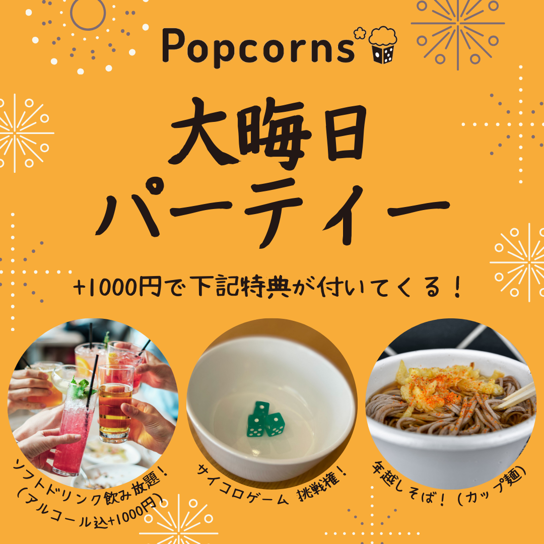 Popcorns*は12月31日も営業いたします!! そこで!! 『Popcorns* 大晦日パーティー』 を開催いたします! ★プラス1000円で特典盛り沢山★ 当日は通常料金に+1000円で下記特典を付けることができます! ・ソフトドリンク飲み放題(+1000円でアルコール込)【モーニングパック、デイパック、ナイトパックの方のみ】 ・サイコロゲーム 挑戦権(詳細は下記) ・年越しそば(カップ麺)※先着15名様限定