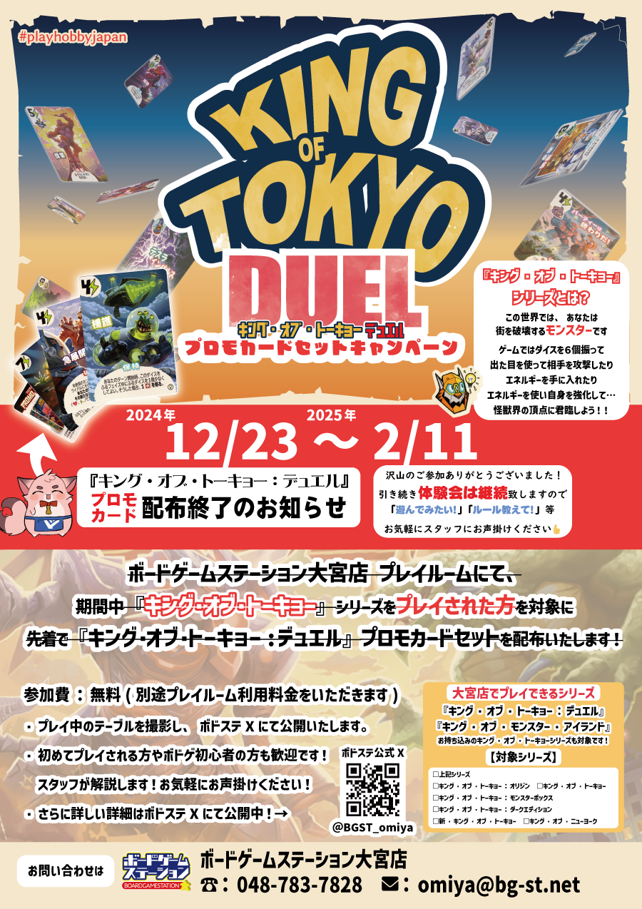 プロモカード『援護』より引用: 未使用のモンスターを2体選び、ライバルにそのうち1体を選ばせる。 あなたの現在のモンスターをその新たなモンスターと入れ替える ・・・強くないか!?!?!? 当店でも現在販売中の『キング・オブ・トーキョー:デュエル』がもっと楽しくなること間違いナシ! ◆開催概要◆ ●開催日:2024年12月23日(金)~2025年2月11日(木) 受付終了時間:平日21:00/土曜20:00/日曜19:00 まで (年末年始の営業時間は上記とは異なります) ●参加費:無料※別途プレイルーム利用料金をいただきます 【参加方法】当店プレイルーム*をご利用いただき *プレイルームのご利用は有料です。 【持込対象シリーズ】 □『キング・オブ・トーキョー:デュエル』 □『キング・オブ・トーキョー』 □キング・オブ・トーキョー:オリジン □キング・オブ・トーキョー:モンスターボックス □『キング・オブ・モンスター・アイランド』 □キング・オブ・トーキョー:ダークエディション □新・キング・オブ・トーキョー □キング・オブ・ニューヨーク 【キング・オブ・トーキョー:デュエル公式HP】 https://hobbyjapan.games/kingoftokyo_duel/ 「準備が大変そう…」「初めてやるゲームだからルールがわからない…」 大丈夫!スタッフが丁寧にルール説明や準備のお手伝いをいたします! 🏠ボードゲームステーション大宮店 〒330-0802 埼玉県さいたま市大宮区宮町1-60 大宮ラクーン5階 お問い合わせ☎048-783-7828 HP⇒https://www.bg-st.net/omiya/ X(旧Twitter)⇒https://twitter.com/BGST_omiya |
