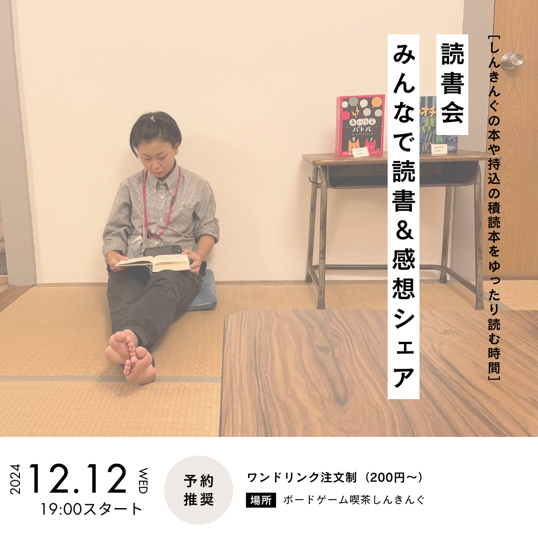 当店はボードゲームのみならず、毎月入れ替わりの本を置いています。 ぜひ本を読みながらゆったり過ごしてもらえると嬉しいなと思い企画しました! 好きな本・積読本・読みかけている本をお持ちください📕 しんきんぐに置いてある菊池中央図書館の本も読めます◎ お申し込みやご質問はSNSへDMもしくは公式LINEへ( https://lin.ee/XKit4TA ) へお願いします! |