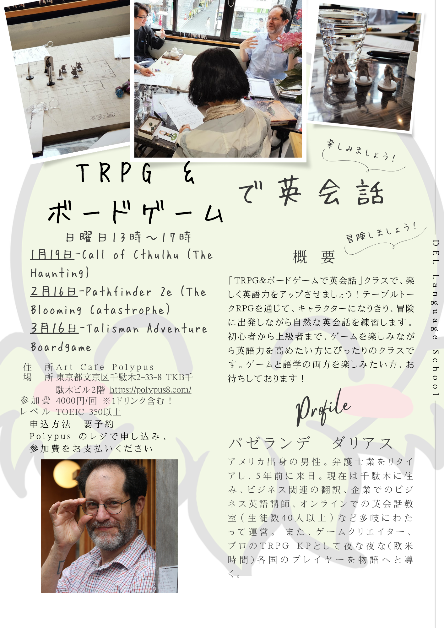 | 詳細内容 | 世界中のTRPGプレイヤーを熱狂させてるKP Mr.パゼランデによる英会話教室! |