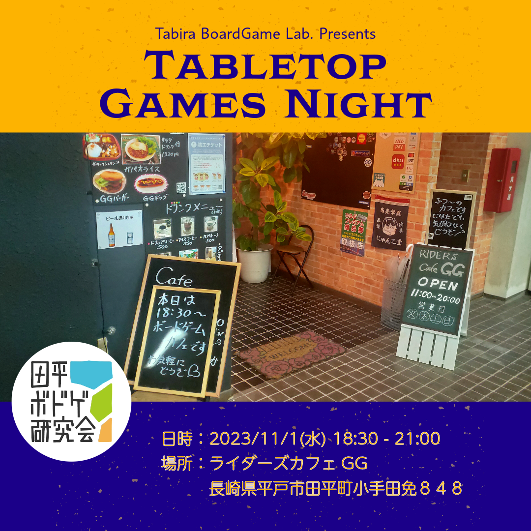 | 詳細内容 | はじめまして!わたしたちは長崎県の田平を拠点にボードゲームを集め、遊びながら学ぶ「田平ボードゲーム研究会」です。 ライダーズカフェGGでは毎月第一水曜日にボードゲーム会を開いています。