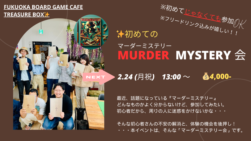 | 詳細内容 | 2月24日(月祝)は、『マーダーミステリーDAY‼️』 この日は、普段トレボで開催している2種類のマーダーミステリーを同じ日でお楽しみいただける日として設定しました。 ① 初めてのマーダーミステリー会🕵️🔰 ・マーダーミステリーに興味を持ち始めた方 ・マーダーミステリーに初めて参加される方 ・何度か体験済だけど、常連さんの中に入って本格的なシナリオをプレイするのは、まだ少し不安…
