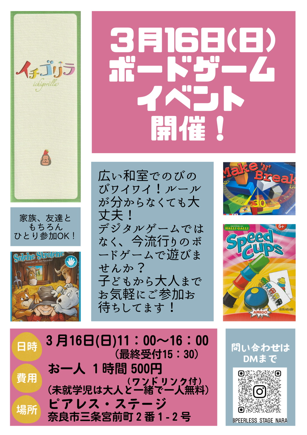 | 詳細内容 | 【ちょこっと遊べるボードゲーム4】 ボードゲームイベント 次回開催は3月16日(日)! JR奈良駅近から西へ徒歩5分♪ ●11:00 ~ 16:00まで開催★ (最終受付時間は15:30) ●参加費:1人1時間につき1時間500円(1ドリンク付き) ※未就学児は大人1人につき1人無料