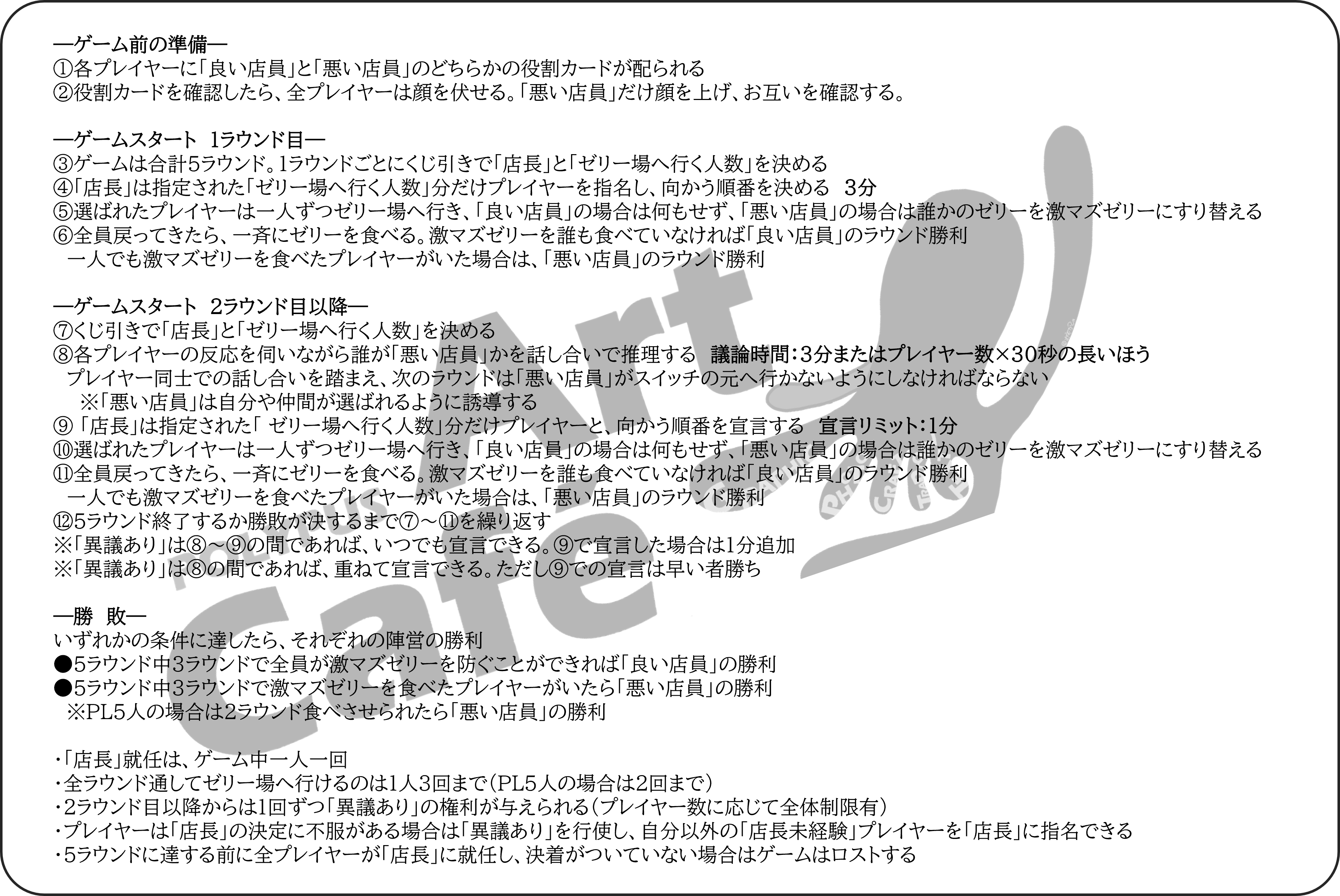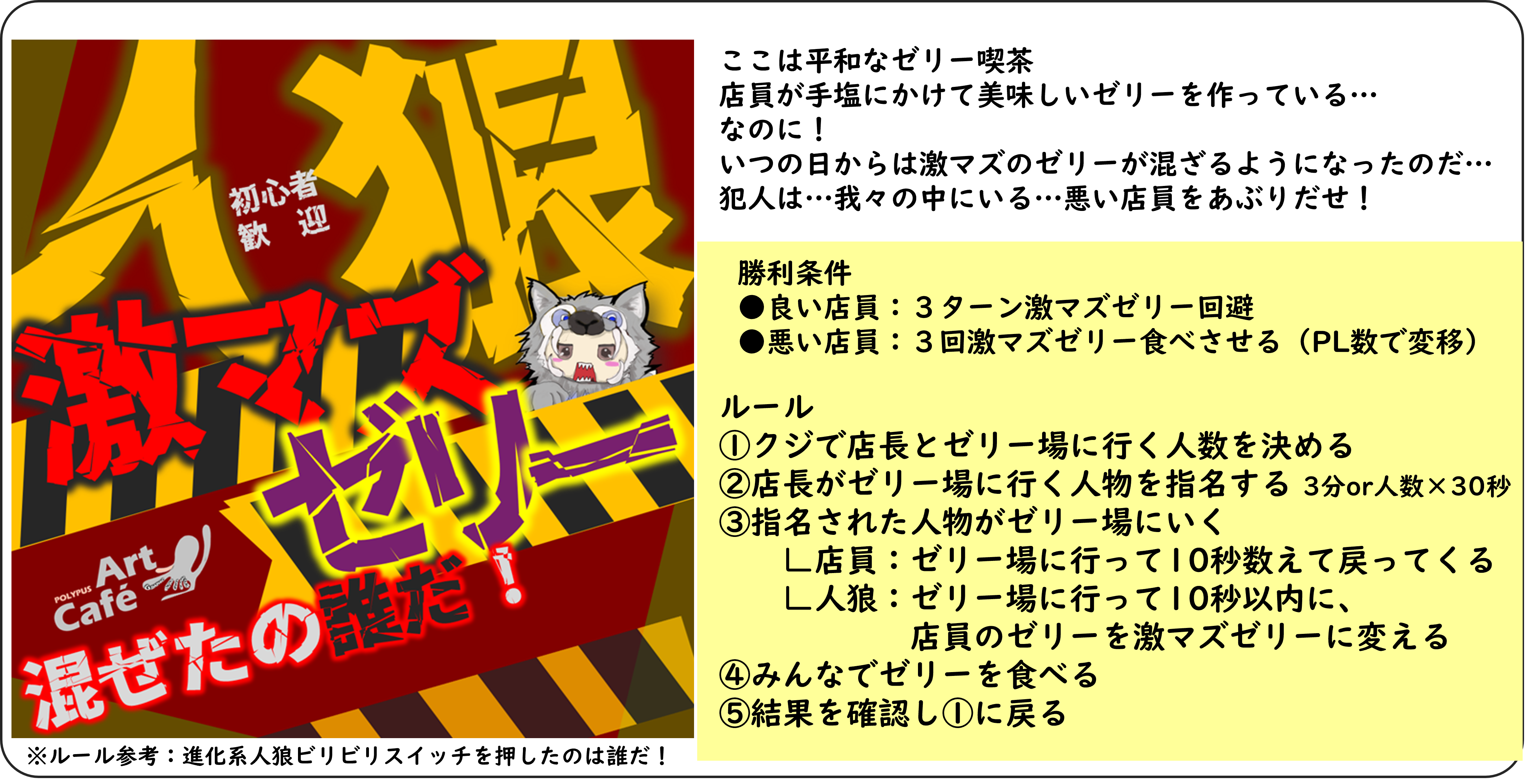 | 詳細内容 | 脱落者なしの進化系人狼『激マズゼリーを混ぜたのは誰だ!』 |