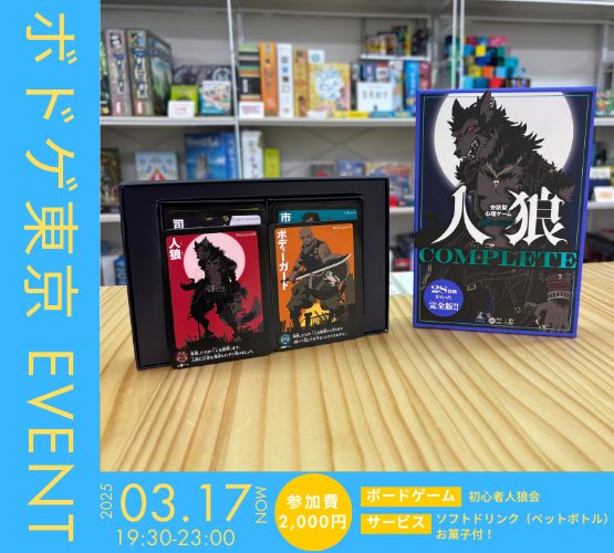 🎲 3/17(月) 人狼初心者歓迎会 開催! 🐺🔎「人狼ゲーム、やってみたいけど難しそう…」 🔹 プレイするボードゲーム 🔹🐺 人狼 COMPLETE 📢 「初めての人狼ゲームでも大丈夫!」 📖 イベントの流れ受付 人狼ゲームプレイ ゲームチェンジ&2回目のプレイ フィードバック&交流タイム 🎮 こんな方におすすめ!✅ 人狼ゲームをやってみたいけどルールが難しそうで不安な方 🔗 参加方法📢 ご予約は当店の予約フォームよりお願いいたします。 📅 開催日時・場所・参加費🗓 2025年3月17日(月) 19:30~23:00 ☎ 当日のご予約はお電話にてお願いいたします。 🃏 「初めてでも楽しめる人狼ゲームの夜!」 #ボードゲーム #ボードゲームカフェ #人狼ゲーム #初心者歓迎 #ボドゲ東京 #心理戦 #推理ゲーム #渋谷イベント |