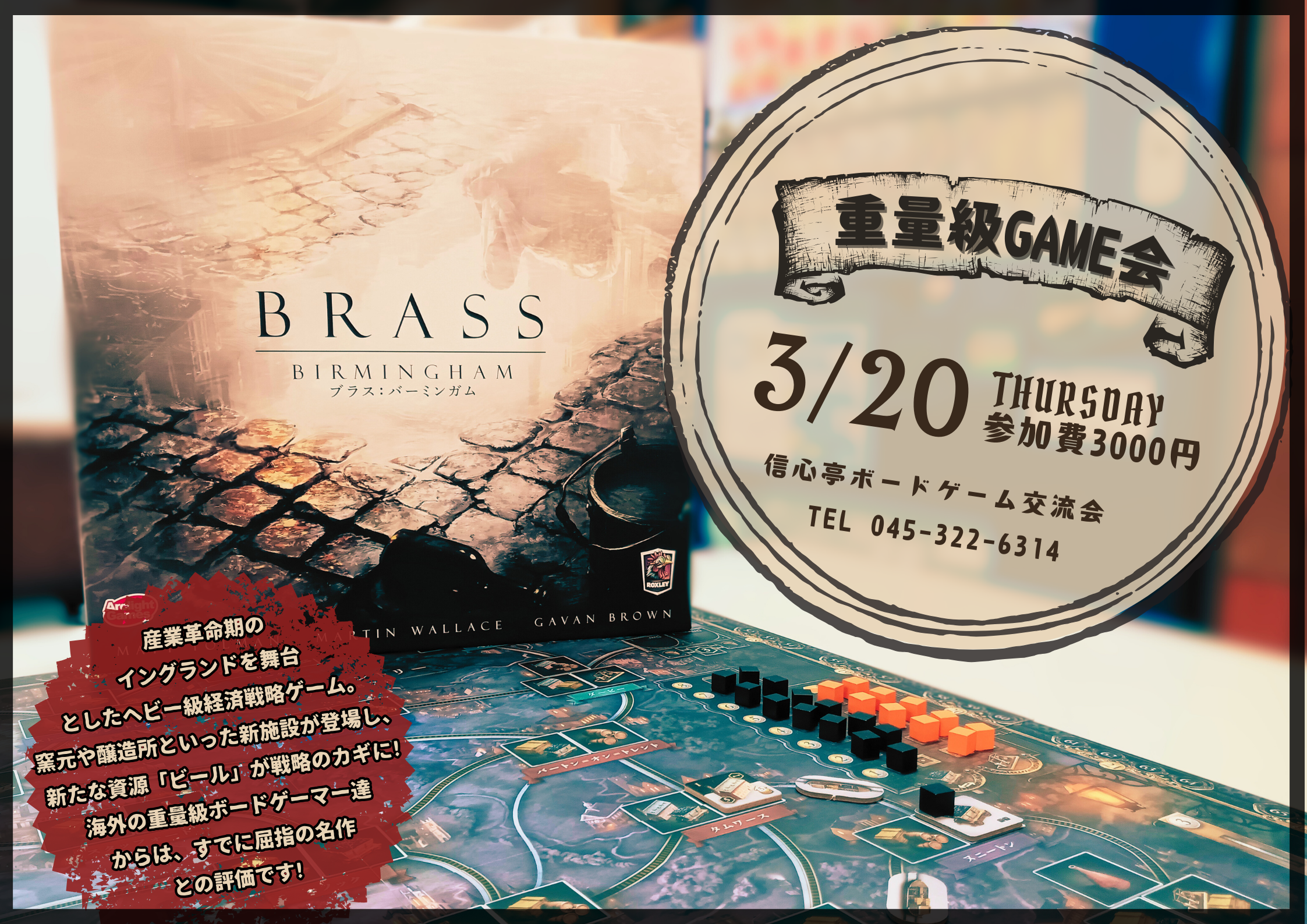 | 詳細内容 | ※2024年9月よりイベント予約機能が追加されていますが ※当ページでの予約受付を行っておりません ※予約方法につきましては当ページ下部の詳細をご確認下さい 「まずは遊んでみよう!」をコンセプトに、ボードゲームを遊んだ事がある方もそうでない方も気軽に参加できるイベントとなっております。 お一人様でも複数名様でも、集まって相席で一緒にゲームを楽しみませんか? 使用するゲーム:【ブラス:バーミンガム】 ボドゲーマサイト内の紹介・レビューページ https://bodoge.hoobby.net/games/brass-birmingham 1ゲーム当たりのプレイ時間 : 90分~120分前後の重量級