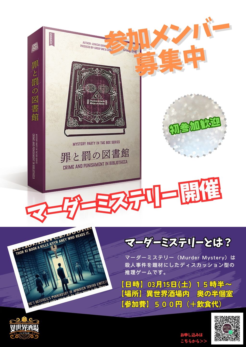 1960年代末、日本。西洋風のモダンな図書館には、「読むと死ぬ奇書」が秘蔵されているとの噂があった。 事件は、図書館の開館三周年記念の日に起きる。記者のインタビューに答える予定だった時刻に、司書が館長を呼びに行ったところ、いつもは鍵のかかっていない館長室のドアがしまっている。司書が鍵を持ってきて開けると、なんと室内では館長が事切れていた! 密室にいたはずの遺体は、こちらに背を向けた椅子に座り、胸にはドストエフスキー著『罪と罰』を抱いていた。 これは自…か? あるいは 他殺? 司書長や小説家といった本にまつわる容疑者 、不気味な奇書の噂、絡み合う過去の事件。物語の結末はどこへ向かうのか? めくられたページは、もう戻らない。 主催 A4B0 協力 異世界酒場パンドラの匣 内容 罪と罰の図書館 日時 2025年03月15日(土) 開始 15:30〜 ※15分前にはお集まり下さい 時間 約150分(お時間は余裕をみて下さい) 場所 異世界酒場パンドラの匣 店内 (奥の半個室スペース) 住所 京都市中京区元法然寺町685 ウィステリアビル3階 人数 5〜6名(埋まり次第終了となります) GM A4B0 参加費 500円(+店内での飲食代) ◎参加希望 ⚠このサイトでお申し込み頂いても参加決定とはなりません。 下記オープンチャットへ参加、イベントにて出欠を入力 (オープンチャットへの参加はQRコードからも可) オープンチャット「3/15_15:30 罪と罰の図書館」 https://line.me/ti/g2/Zd3S-UDlUZqBBlg3Rg5FNWsA3LhcrVLXMxRcEQ?utm_source=invitation&utm_medium=link_copy&utm_campaign=default ※まだ予定不明でも興味がある方には参加していただいております! |