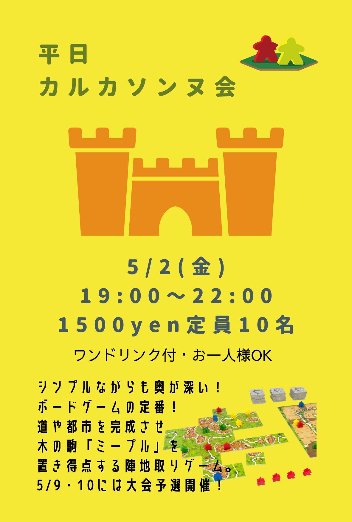 | 詳細内容 | タイルをつなげ発展していく道や都市、草原などに「ミープル」という駒を置き得点を獲得していく『カルカソンヌ』を楽しめるイベントです! 3時間でボリュームたっぷり!よりたくさんのゲームを、そしてよりたくさんの方とカルカソンヌを楽しめます!! 皆でワイワイボドゲで楽しみましょう! 🕍土曜カルカソンヌ会 ※ボドゲーマからの予約は受け付けておりません。参加希望者は上記の申し込み方法から必ずお申し込み下さい。