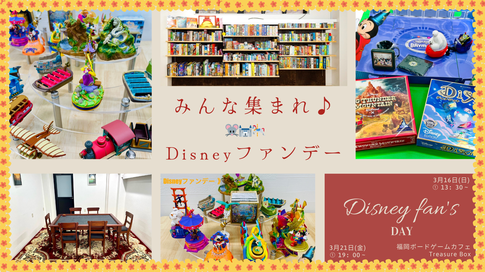| 詳細内容 | 福岡ボードゲームカフェTreasure Box(トレボ)の、2025年3月の新企画をお知らせします🎵 ① 3月16日(日)13:30頃~ ② 3月21日(金)19:00頃~ << みんな集まれ!Disneyファンデー >>を開催します。 前からトレボにあった『ビッグサンダーマウンテン』に加え、この度新たに『スペースマウンテン』と『ホーンテッドマンション』が仲間入り!!