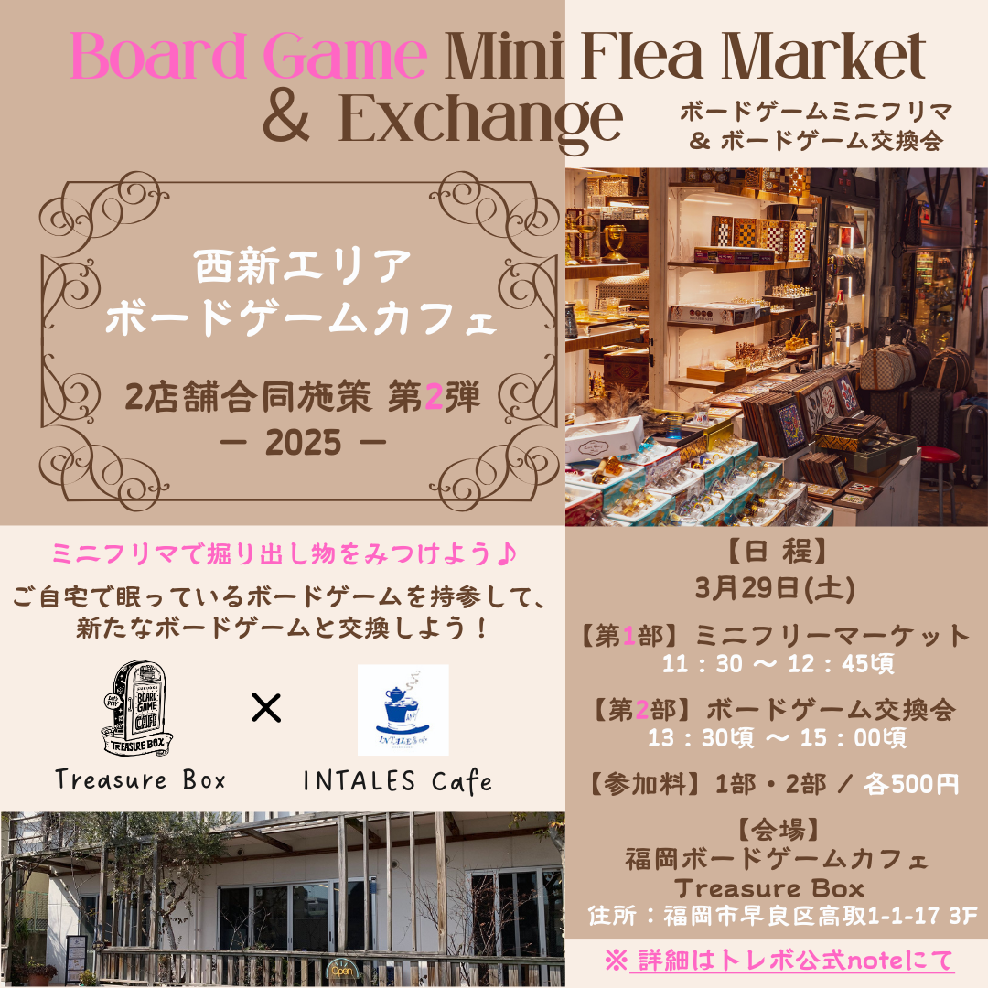 | 詳細内容 | 福岡市早良区・西新エリアのボードゲームカフェ 「Treasure Box」✖「 INTALES Cafe」の2025年 2店舗合同施策 第2弾!! 【日時】3月29日(土)11:30〜15:00頃 イベント概要と注意事項(補足事項)はこちらです👇