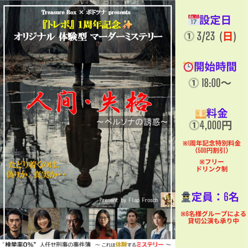| 詳細内容 | 福岡ボードゲームカフェ Treasure Box(トレボ) 1周年記念新イベント!! オリジナルシナリオの店舗探索型マーダーミステリー「人間・失格~ペルソナの誘惑~」 こちらのシナリオは「オリジナル内容」となっており、当店のレイアウトや想いを汲んでいただいた上で作られたトレボver.となっており、店内を実際に探して情報収集していただく体験型を採用🕵 トレボでしか体験できない「マーダーミステリー」がここにある・・・ 3月の公演日はこちら💁
